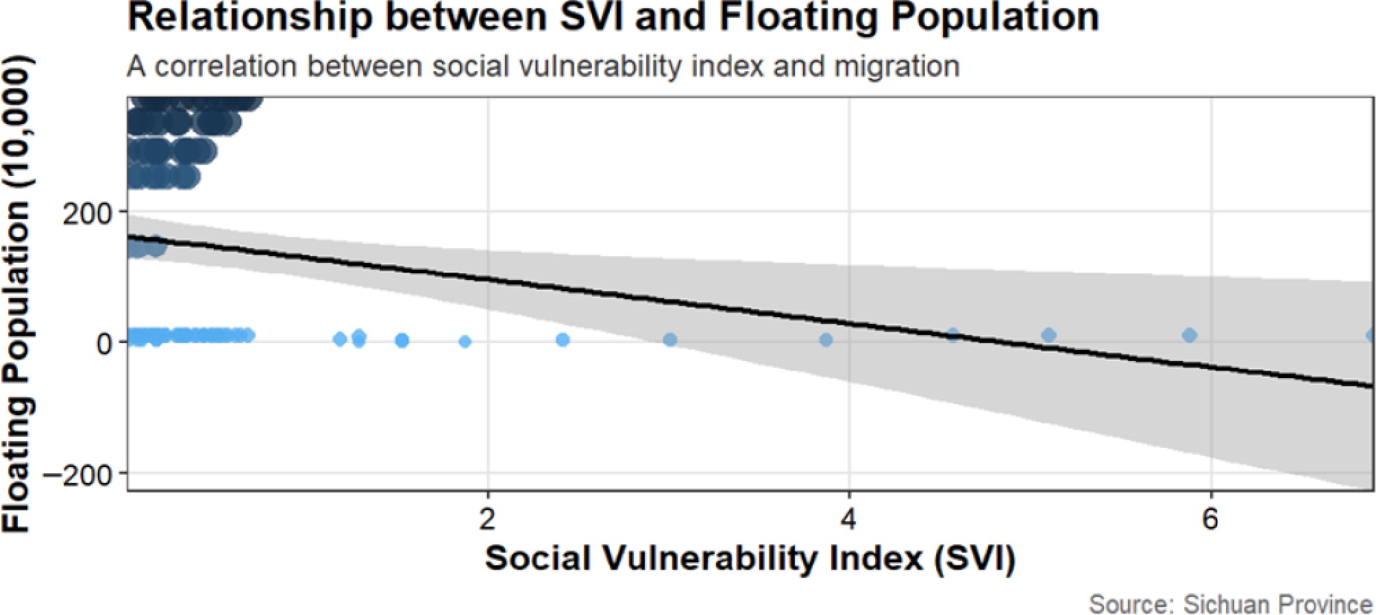 In Fig. 4, the blue and dark blue points represent different data samples, illustrating the floating population under varying SVI values. The black line denotes the fitted trend line, reflecting the overall relationship between SVI and the floating population. The gray shaded area represents the confidence interval, indicating the uncertainty range of the trend line. As the SVI increases, the floating population exhibits a declining trend, suggesting that regions with higher social vulnerability may experience reduced population mobility. This figure demonstrates a negative correlation between SVI and the floating population, implying that areas with elevated social vulnerability, potentially caused by economic, social, or other factors, tend to have less population movement.