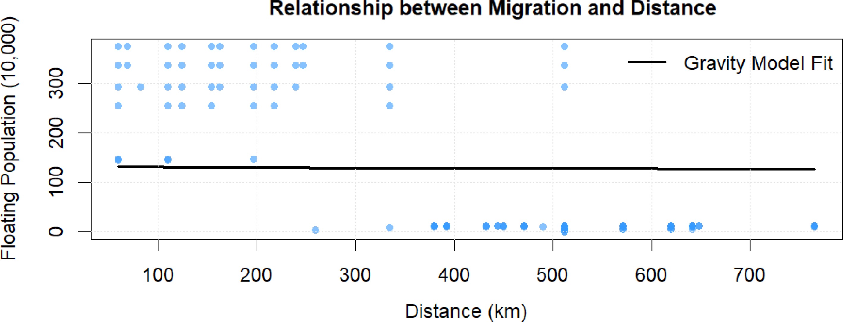 In Fig. 5, the blue points represent different data samples, showing the floating population at varying distances. The black line represents the trend line fitted by the gravity model, illustrating the overall relationship between distance and the floating population. The figure reveals that the floating population is higher at shorter distances and gradually decreases as the distance increases, aligning with the expectations of the gravity model, which posits that migration decreases with greater distance. Within shorter distances (0–200 km), the floating population exhibits significant fluctuations, whereas at longer distances (beyond 400 km), the floating population stabilizes with minimal variation.