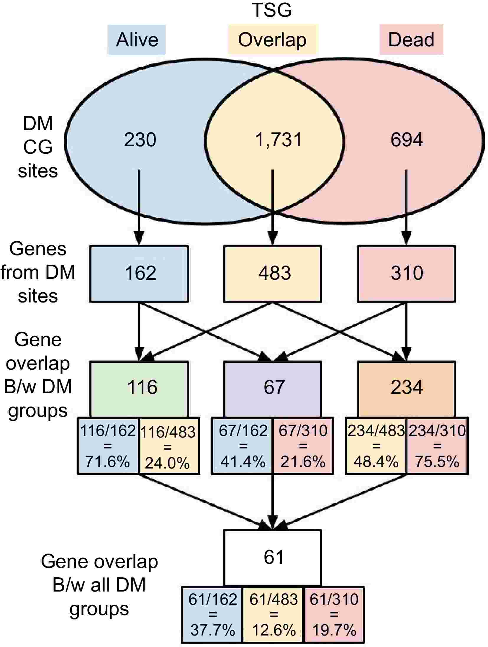 DM CG sites were identified by performing paired T-tests using M-values. A CG site was identified as a DM site if its p-value was < 0.05 and its absolute beta-value mean difference was ≥ 0.2. DM sites are summarized in Table 1. This table shows that Dead samples tended to have more DM sites than Alive samples when analyzing all 391,459 CG sites (8.68% vs 6.94%) and all TSG sites (9.34% vs 7.55%). The difference was statistically significant, see p-values shown in the last column of Table 1. As shown in Fig. 2, DM CG sites were then split into three different categories as defined in the previous section: alive-only DM, dead-only DM, and overlap DM. There were 230 alive-only DM sites, 694 dead-only DM sites, and 1,731 overlap DM sites, as shown in Fig. 2.