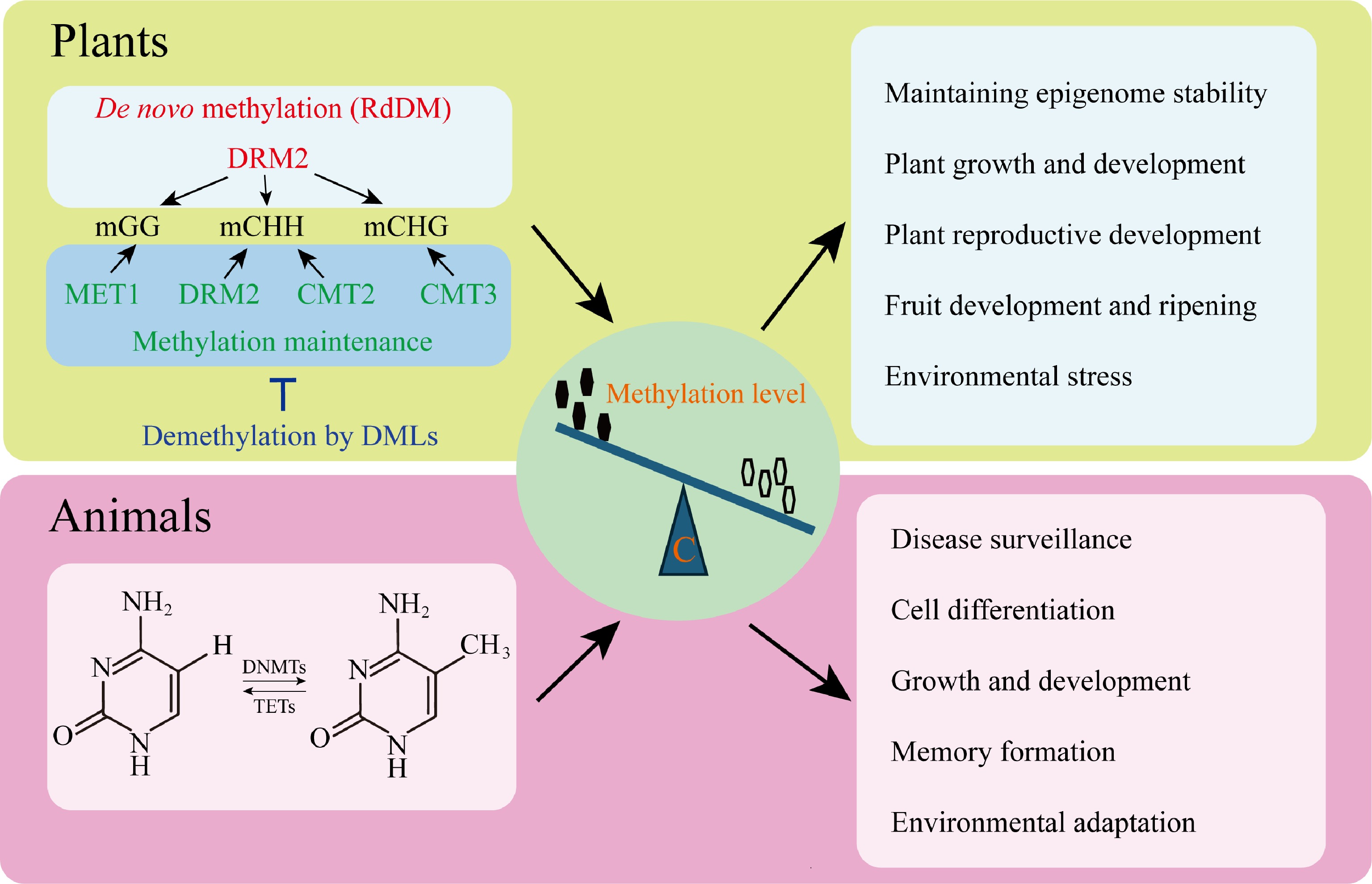 Core regulatory mechanisms of DNA methylation in eukaryotes. Cytosine DNA methylation is self-regulated both during maintenance and de novo in plants. The RNA-directed DNA methylation (RdDM) pathway uses the DOMAINS REARRANGED METHYLTRANSFERASE TWO (DRM2) to recruit de novo methylation and METHYLTRANSFERASE1 (MET1) to maintain CG methylation. DNA methylation in plants is maintained by plant-specific CHROMOMETHYLASEs (CMTs), while CHH methylation is maintained by CMTs and DRM2, both independently and in conjunction with RdDM. It is counteracted by DNA demethylases such as REPRESSOR OF SILENCING ONE (ROS1), DEMETER (DME)-LIKE TWO (DML2), and DML3 that activate the expression of genes. The combination of these pathways ensures the stability of epigenetics and controls key biological functions, including plant development, reproduction, fruit development, and ripening, as well as the stress response. The CpG dinucleotides of DNA methylation are mainly confined to animals and regulated by the counteracting activities of DNA METHYLTRANSFERASEs (DNMTs) and ten-eleven translocation (TET) proteins. This control equilibrium supports the process of development, cell differentiation, defense against disease, formation of memory, and adaptation to the environment.