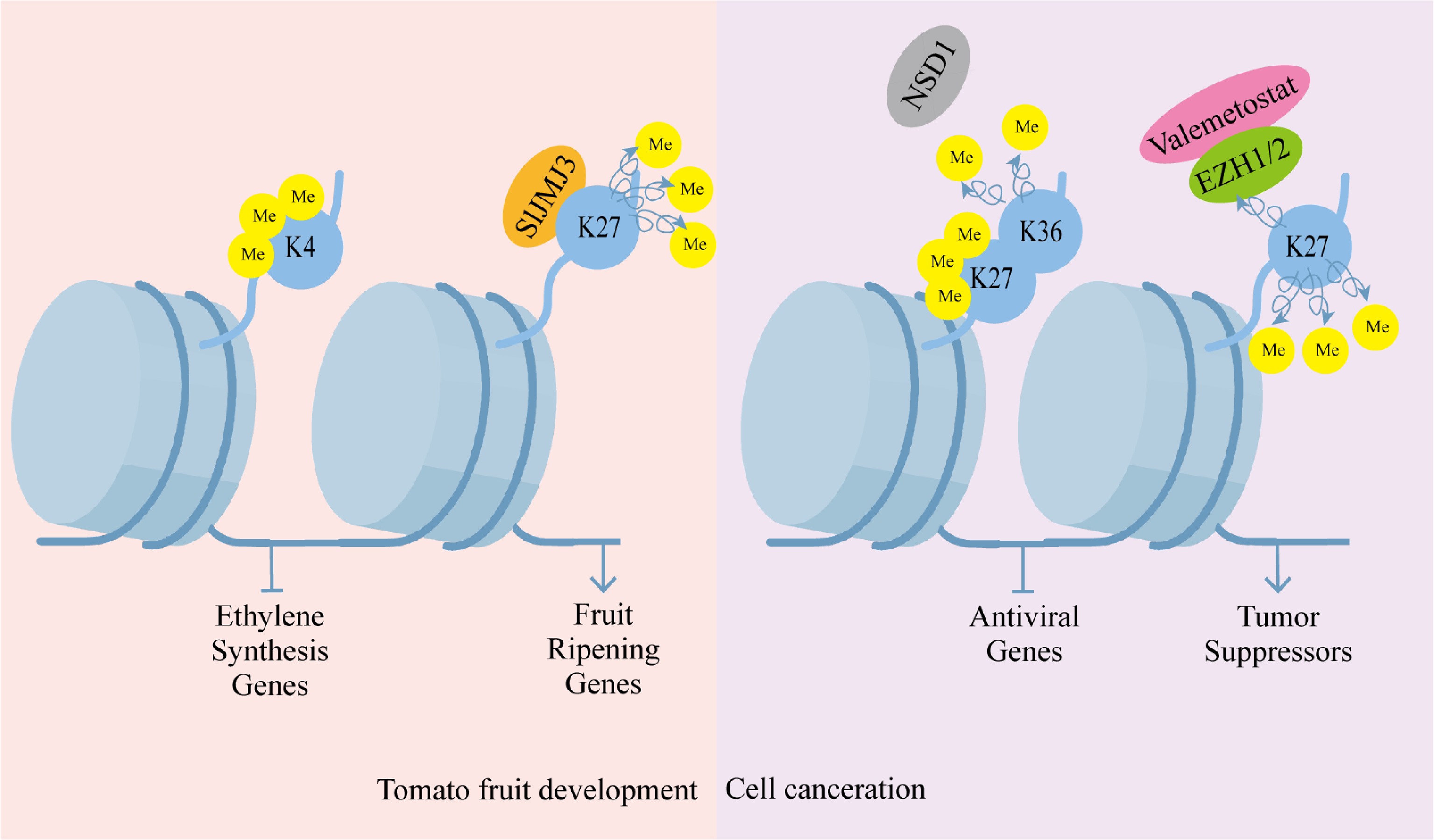 Histone methylation regulation pattern. Histone methylation regulation is crucial in plant development. Histone H3 lysine four trimethylation (H3K4me3) is linked to the silencing of ethylene biosynthesis genes during tomato fruit ripening, and the histone demethylase Jumonji C domain-containing protein three (SlJMJ3) facilitates ripening by deposing the ethylene biosynthesis-related genes of H3K27me3. It is also crucial in the progression of diseases in humans. Pathological progression of cancer is characterized by aberrant histone methylation in cancer cells, and dysregulated activities of histone methyltransferases are often linked to carcinogenic transformation. Silencing of antiviral genes is caused by the loss of H3K36me2, accompanied by a counterbalancing increase in H3K27me3. Valemetostat or pharmacological inhibition of the enhancer of zeste homologs EZH1/2 reinstates tumor suppressor gene functionality by inhibiting the repression of H3K27me3.