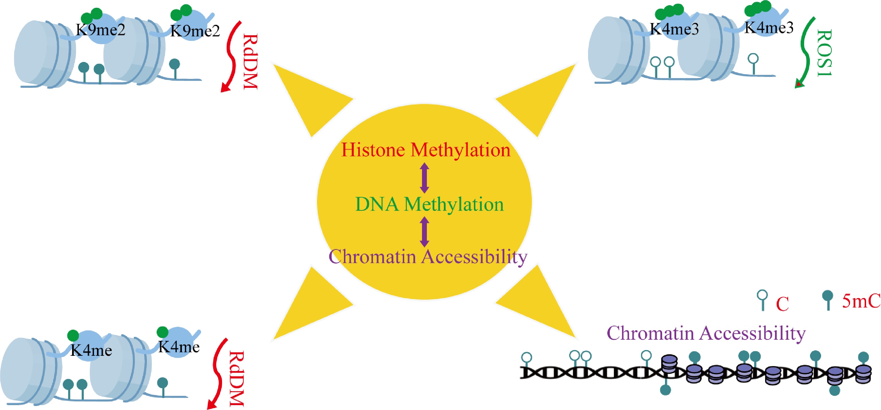 Synergistic regulation between DNA methylation and histone modifications. This depicts the synergetic control between histone modifications and DNA methylation. These essential interactions are: (i) RdDM-mediated small RNA-dependent de novo DNA methylation, (ii) H3K9me2 deposition and H3K4me establishment, (iii) H3K4me3-mediated hiring of DNA demethylases, and (iv) enrichment of histone modifications by DNA methylation. Abbreviations: 5mC, 5-methylcytosine; C, cytosine.