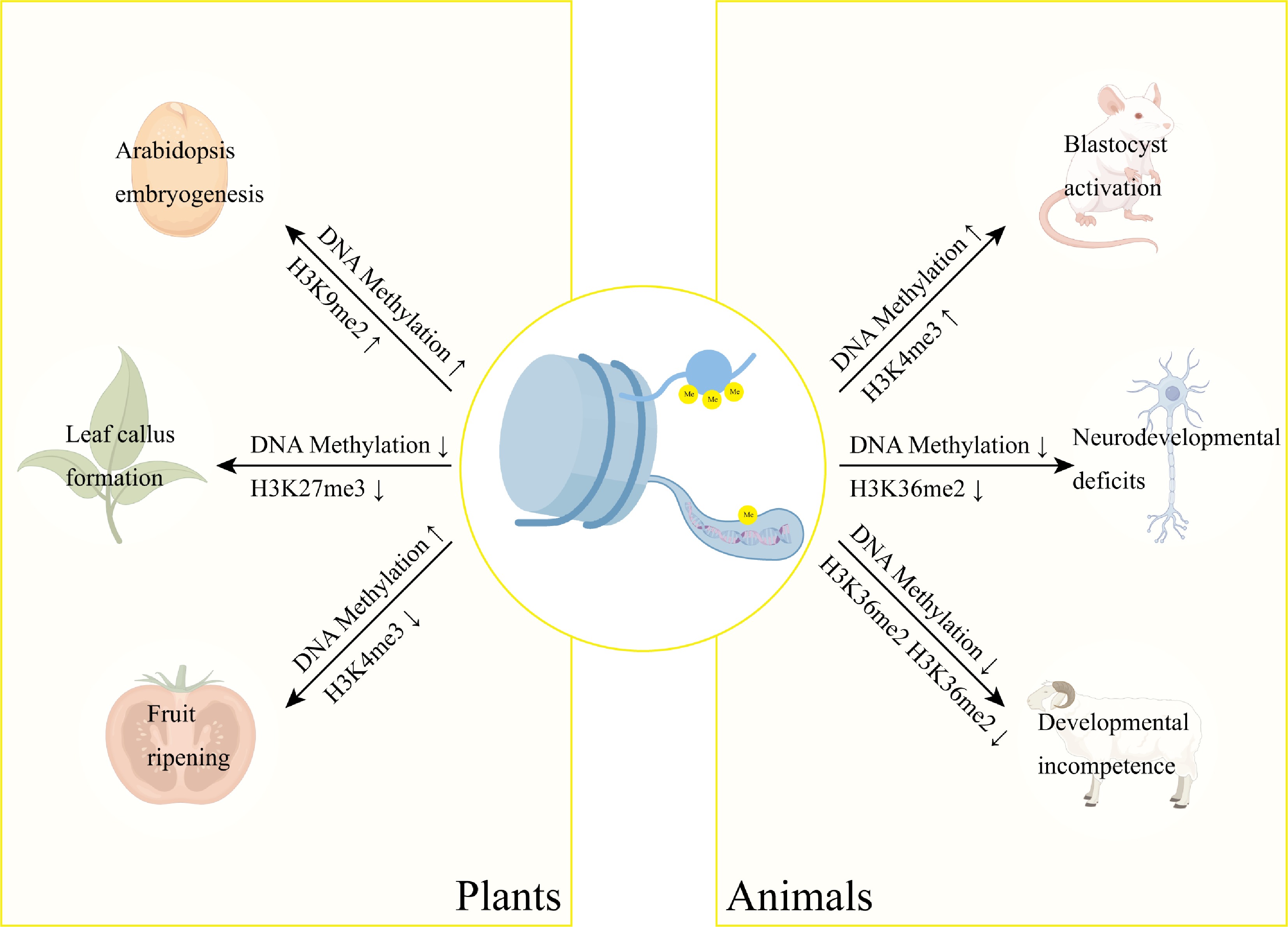 Interplay between DNA methylation and histone methylation in developmental regulation. DNA methylation and histone methylation function synergistically in gene regulation. These epigenetic modifications form an integrated regulatory network controlling key developmental processes across species, including Arabidopsis embryogenesis, peach somatic embryogenesis, and tomato fruit ripening. Notably, their coordinated action is equally essential in mammalian systems, regulating mouse oocyte activation, neural development, and somatic cell reprogramming in cloned goats.
