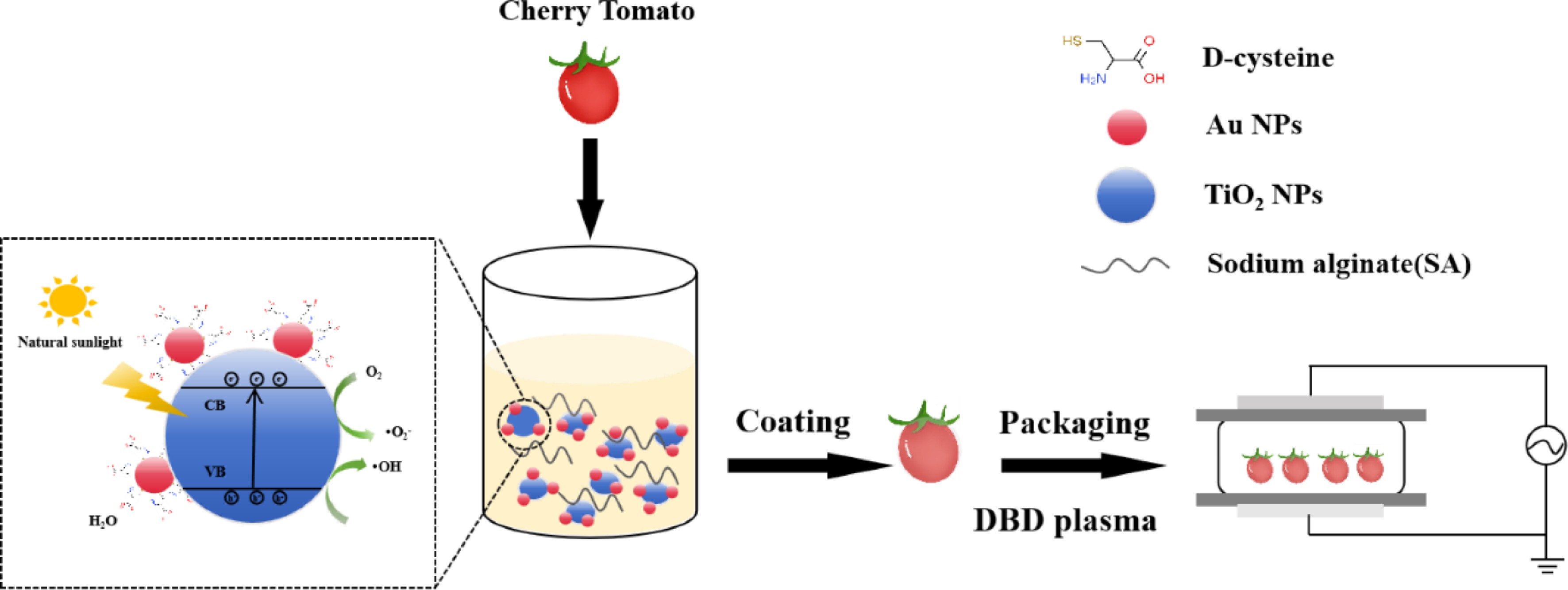 To overcome these limitations, this study introduces an innovative physical–chemical synergistic system. As illustrated in Fig. 1, an integrated approach was developed combining a chiral D-cys/Au NPs-modified TiO2 (DAT) nanoparticles-embedded sodium alginate (SA) coating matrix with dielectric barrier discharge (DBD) plasma treatment for simultaneous preservation and pesticide degradation of cherry tomatoes. The DAT/SA composite film provides sustained, visible-light-responsive photocatalytic activity at the fruit surface, enabling targeted generation of ROS for efficient pesticide degradation while minimizing nutrient loss. Concurrently, the DBD plasma treatment delivers a potent burst of RONS and physical agents for immediate surface microbial inactivation and initiates pesticide breakdown. This synergistic interplay effectively addresses the core challenges of deep pesticide residue penetration, sustained antimicrobial action, and energy–efficient, quality–preserving operation.
