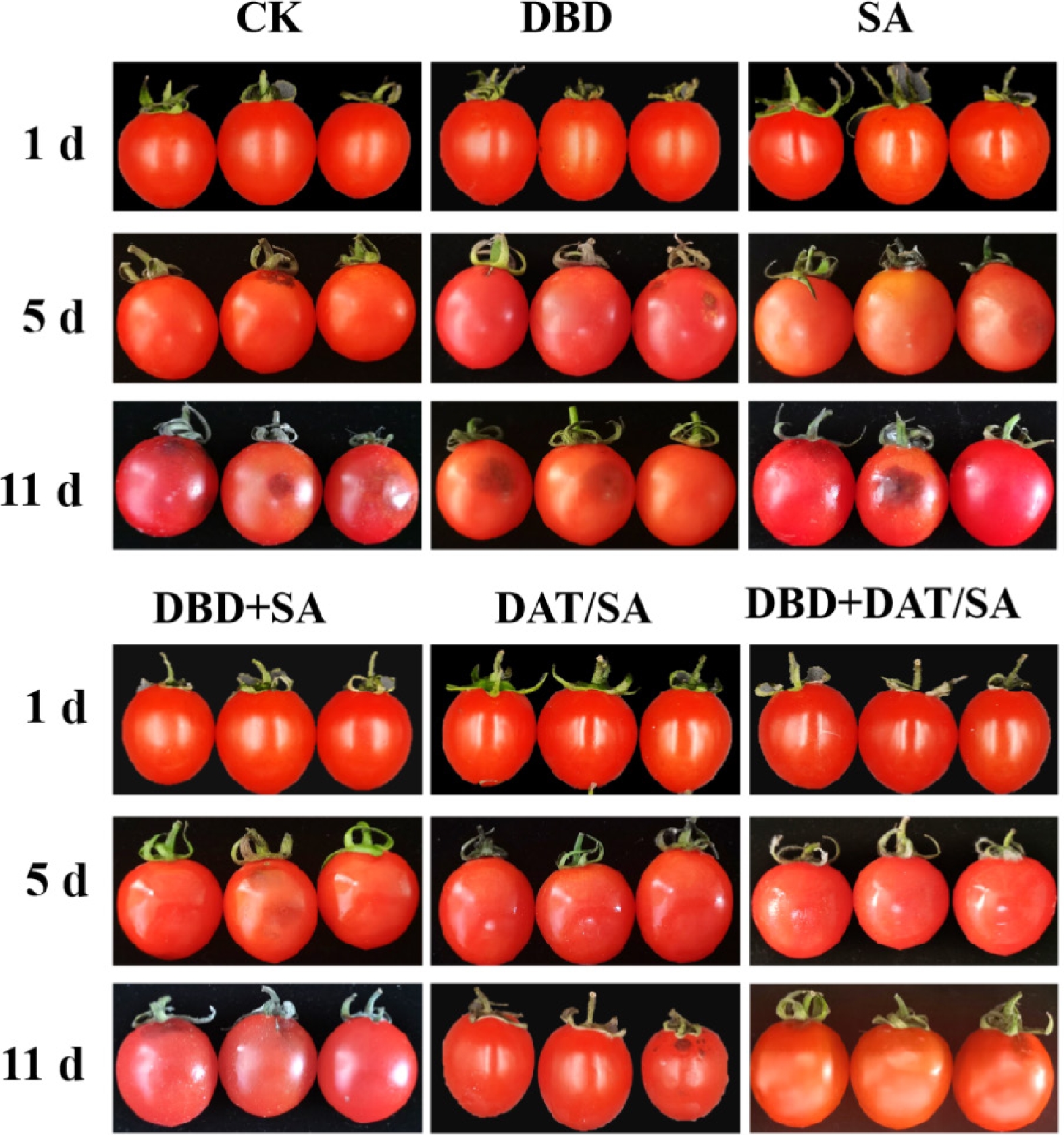 Sensory evaluation (Fig. 3) demonstrated that the combined DBD + DAT/SA treatment provided the most effective preservation. Control (CK), DBD-only, and SA-only samples developed visible moldy spots by day 5 and were completely soft and spoiled by day 11. Although the DBD + SA treatment delayed mold development, it failed to prevent final spoilage. In contrast, both DAT/SA and DBD + DAT/SA treatments significantly inhibited mold growth and decay, with visible spoilage only appearing on day 11, indicating a substantial extension of marketable life.