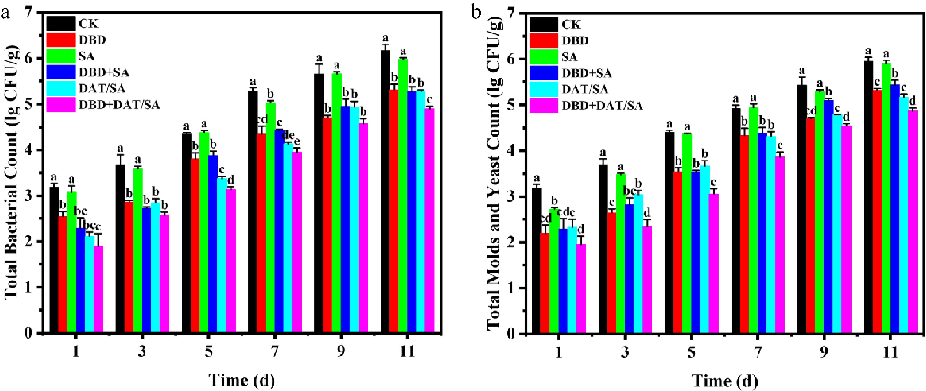 This preservation effect was strongly associated with microbial suppression (Fig. 4a, b). All active treatments except SA-alone reduced microbial counts relative to the CK group from day 1. The initial total aerobic bacterial count in the CK group was 3.18 log CFU/g, while the DBD, DAT/SA, and DBD + DAT/SA treatments showed reductions of 0.64, 1.02, and 1.28 log CFU/g, respectively. The DBD + DAT/SA group exhibited the strongest bacterial inhibition. A similar trend was observed for molds and yeasts. By day 11, the CK group (6.18 lg CFU/g) exceeded the microbial safety threshold of 6 log CFU/g, whereas the DBD + DAT/SA group remained 1.28 and 0.98 log CFU/g below CK for bacteria and fungi, confirming a potent and sustained antimicrobial synergy.