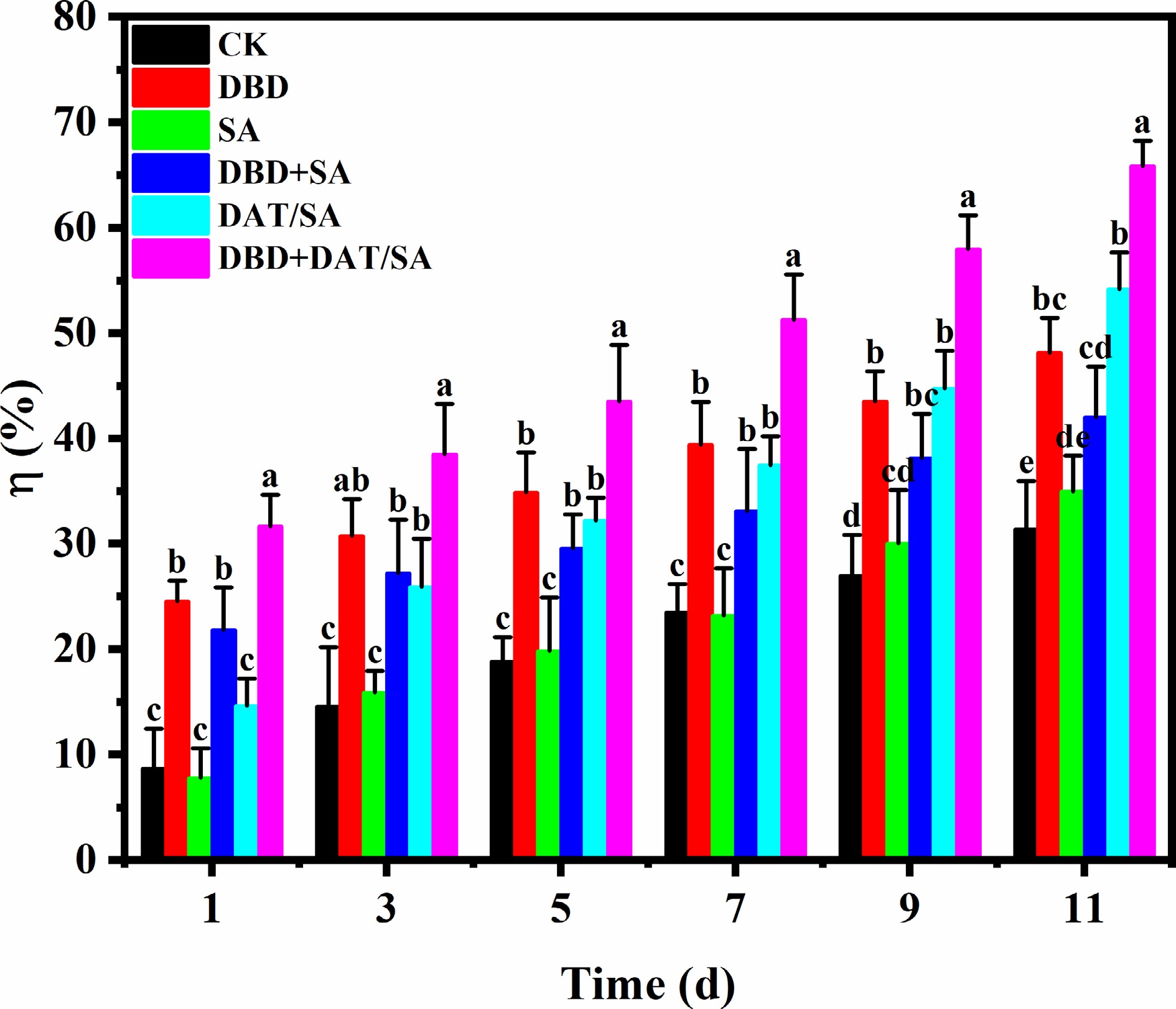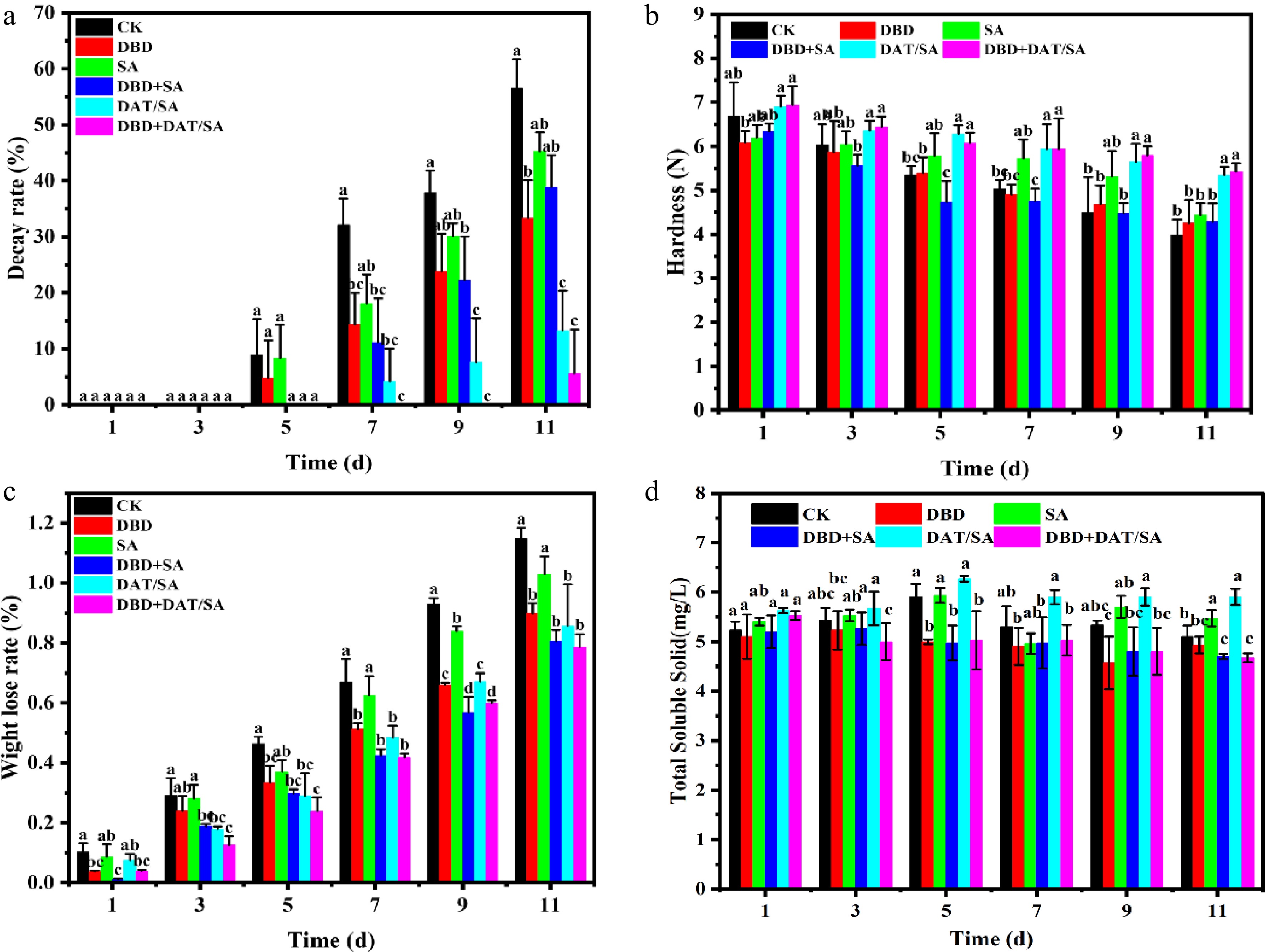 Decay rate (Fig. 5a), an important consumer-quality indicator, further highlighted the synergistic effect[26]. Decay began on day 3 (CK and SA), day 5 (DBD-alone), and day 7 (DAT/SA and DBD + SA). The DBD + DAT/SA treatment provided the strongest protection, delaying decay onset until day 9. By the end of the storage period (day 11), the decay rates of DAT/SA and DBD + DAT/SA groups were 44.82% and 50.99% lower than that of CK, respectively. Among them, the DBD + DAT/SA coating exhibits the best efficacy, extending the storage period by more than 4 d.