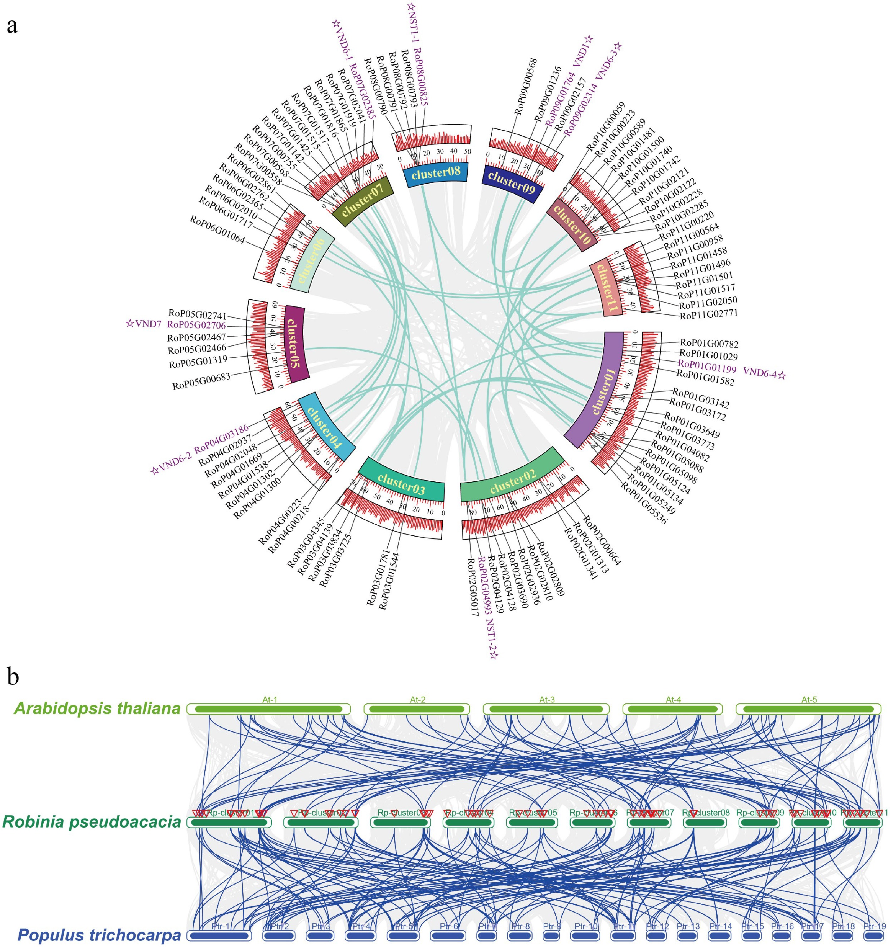 Intra-species and inter-species collinearity analysis of NAC genes in Robinia pseudoacacia, Arabidopsis thaliana, and Populus trichocarpa. (a) Intra-specific collinearity analysis of NAC genes in Robinia pseudoacacia. (b) Interspecific collinearity analysis of NAC genes among R. pseudoacacia, P. trichocarpa, and A. thaliana.