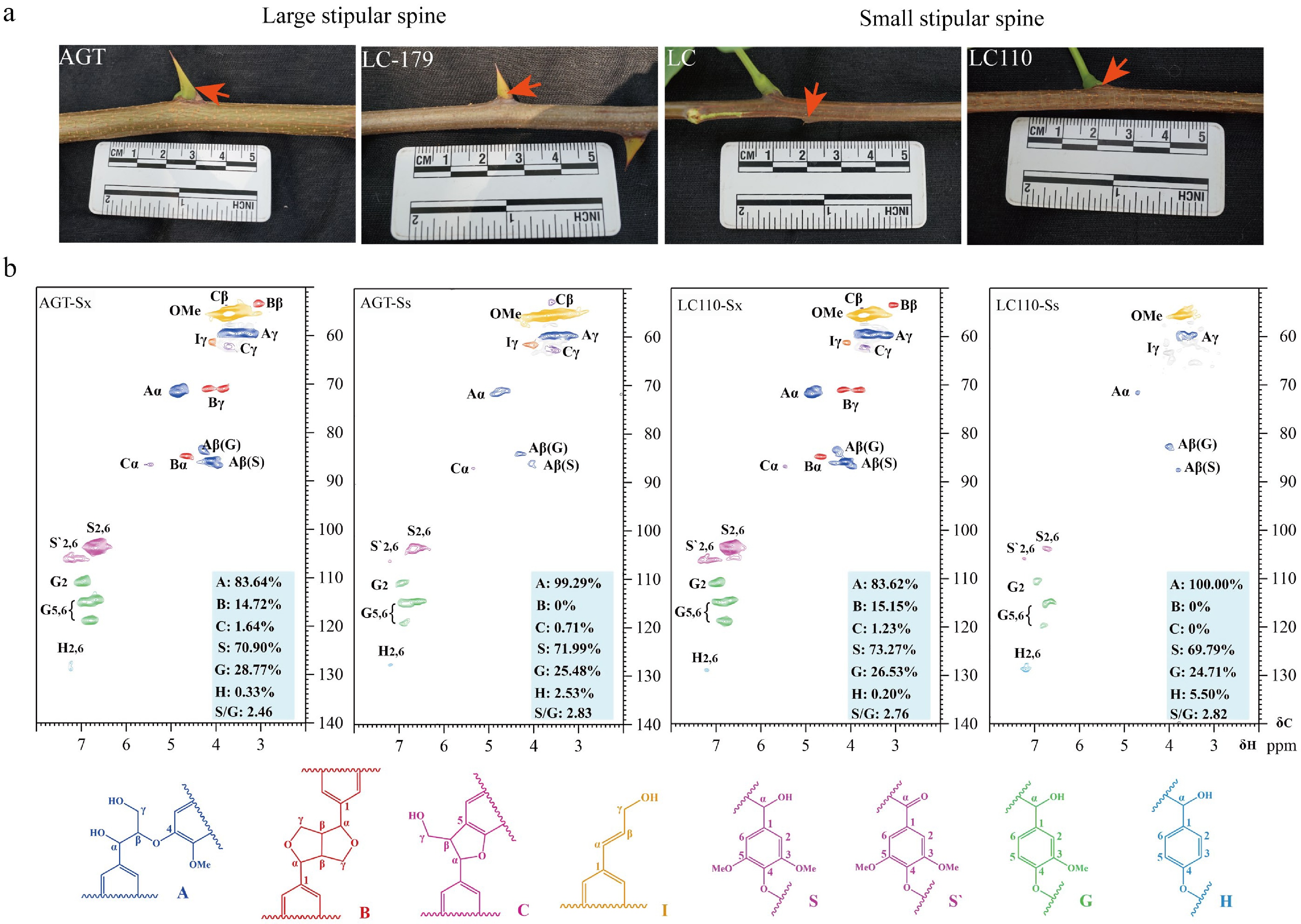 Lignin accumulation in stipular spines and stems of Robinia pseudoacacia. (a) Photos show the stipular spines in large-spined (AGT and LC179) and small-spined (LC and LC110) varieties. (b) NMR analysis of stem xylem (Sx) and stipular spine (Ss) in the black locust varieties AGT and LC110.