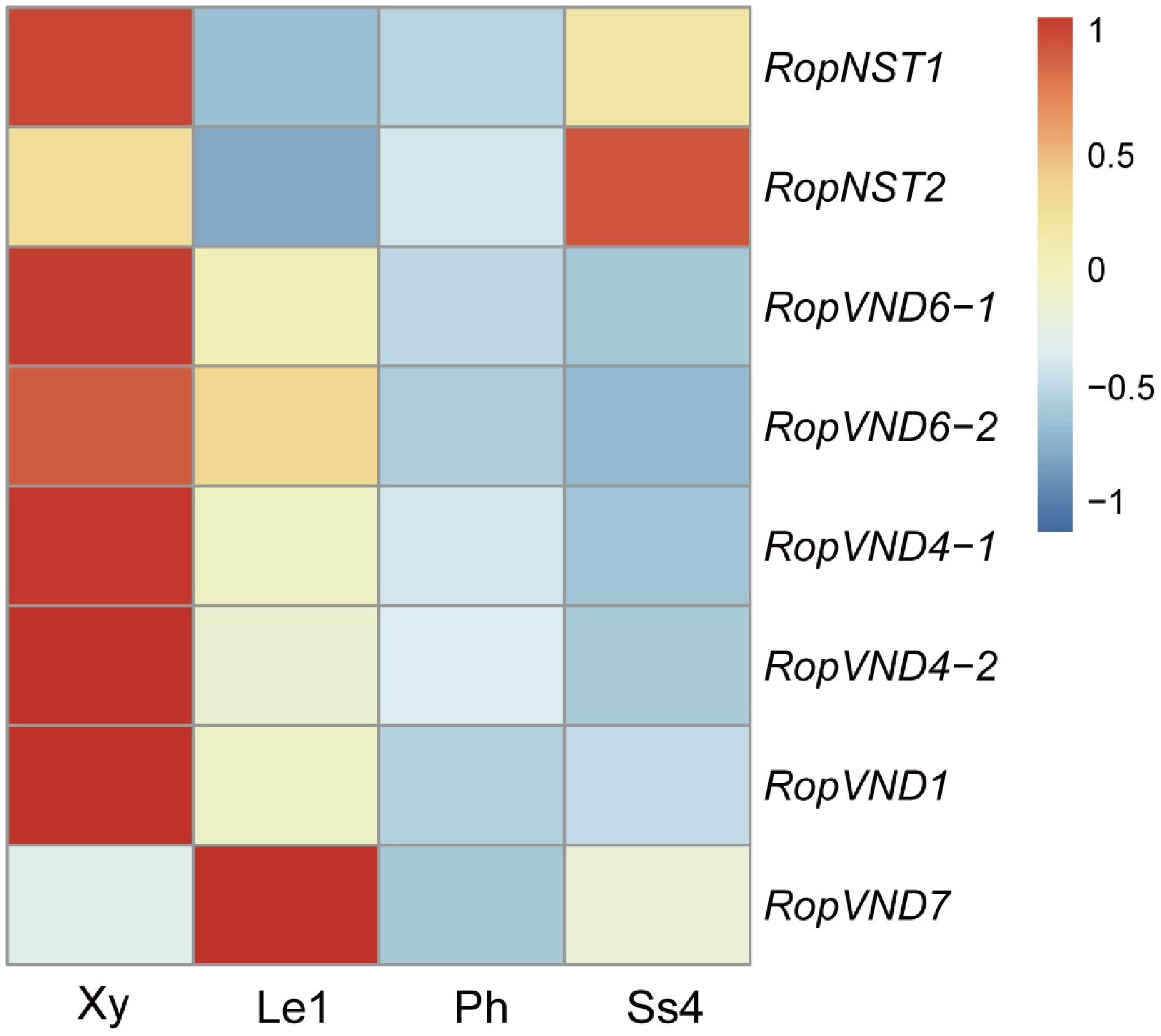 Heat map shows the relative expression levels of six VND and two NST genes in developing xylem (Xy), leaf stage 1 (Le1), phloem (Ph) and stipular spine stage 4 (Ss4) of R. pseudoacacia. Fragments per kilobase million (FPKM) values were normalized using the Z-score method. 'Rop' is the abbreviation of Robinia pseudoacacia, representing the species-specific genes of this plant.