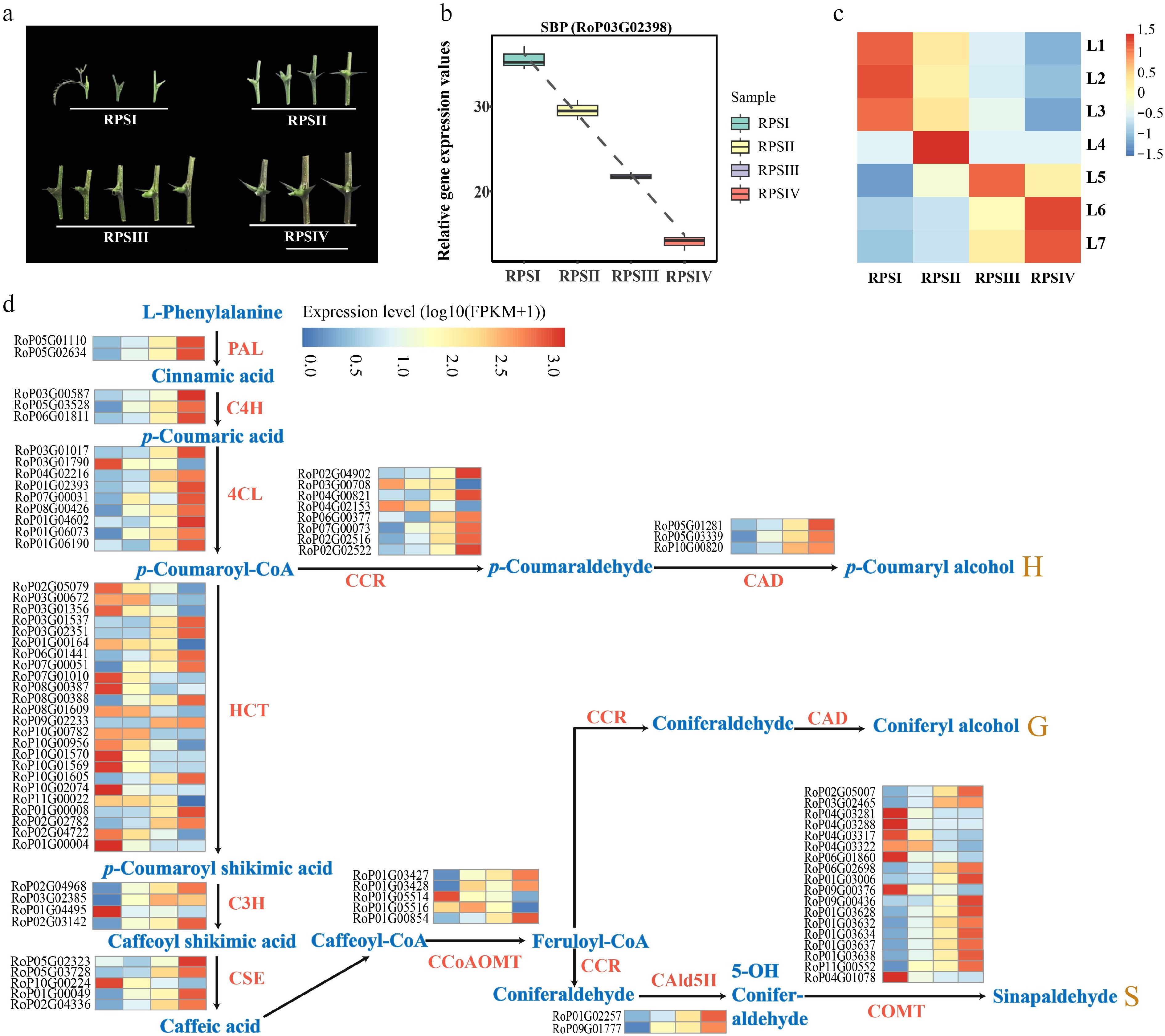 Gene expression analysis in different developmental stage of stipular spines. (a) Four different developmental stages of stipular spines, including RPSI (1st to 3rd pair of stipular spines, counting from top), RPSII (the 5th pair), RPSIII (the 7th pair), and RPSIV (the 10th pair). (b) Relative expression values of SBP (RoP03G02398) which was used as the bait gene. (c) The heatmap of normalized TPMs (z-scores color-coded) at each time point is shown. (d) Heat map show the expression levels of differentially expressed enzyme genes of monolignol biosynthetic pathway. Blue color indicates low expression levels and red color indicates high expression levels. Abbreviations used in the figure: PAL, Phenylalanine Ammonia-Lyase; C4H, Cinnamate 4-Hydroxylase; 4CL, 4-Coumarate: CoA Ligase; CCR, Cinnamoyl CoA Reductase; CAD, Cinnamyl Alcohol Dehydrogenase; HCT, Hydroxycinnamoyl-CoA Shikimate/Quinate Hydroxycinnamoyl Transferase; C3H, p-Coumarate 3-Hydroxylase; CSE, Coumarate 5-Hydroxylase; CCoAOMT, Caffeoyl CoA O-Methyltransferase; CAld5H, Coumaraldehyde 5-Hydroxylase; COMT, Caffeic Acid O-Methyltransferase.