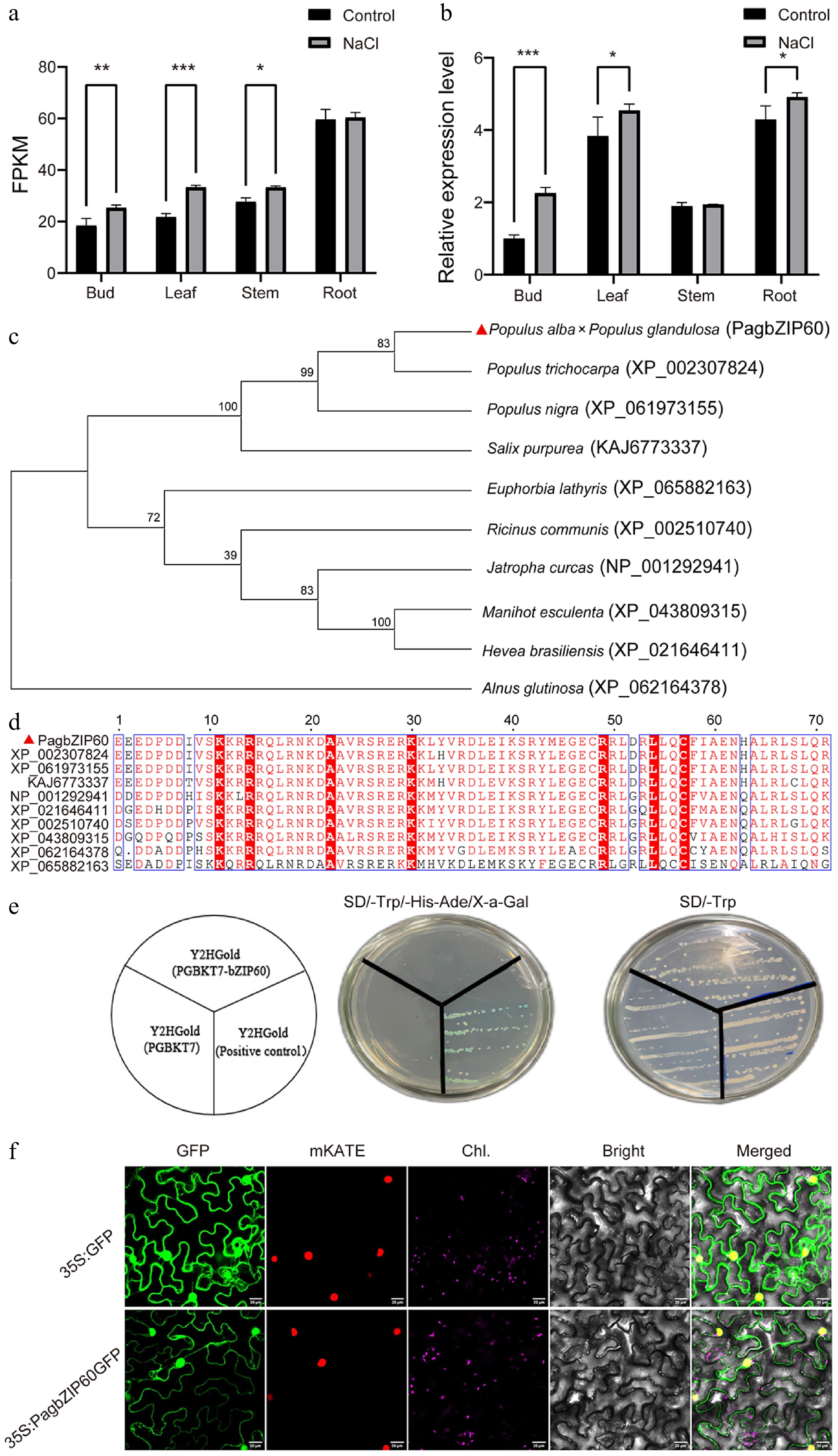 Gene expression and protein characterization of PagbZIP60. (a) Expression pattern of PagbZIP60 in different tissues of poplar under 150 mM NaCl, detected by RNA-seq. The stars indicate significant differences between samples, * p < 0.05, ** p < 0.01, *** p < 0.001. (b) Expression pattern of PagbZIP60 in different tissues of poplar under 150 mM NaCl, detected by RT-qPCR. (c) Phylogenetic tree of PagbZIP60 and representative plant bZIP proteins. (d) Multiple alignment of the bZIP conserved domain in PagbZIP60. (e) Transactivation assay of PagbZIP60 in yeast cells. (f) Subcellular localization of PagbZIP60 protein in tobacco leaves. GFP: green fluorescence; mKATE: nucleus marker; Chl.: chloroplast marker; Bright: bright field; Merged: merged field; Bar: 20 μm.