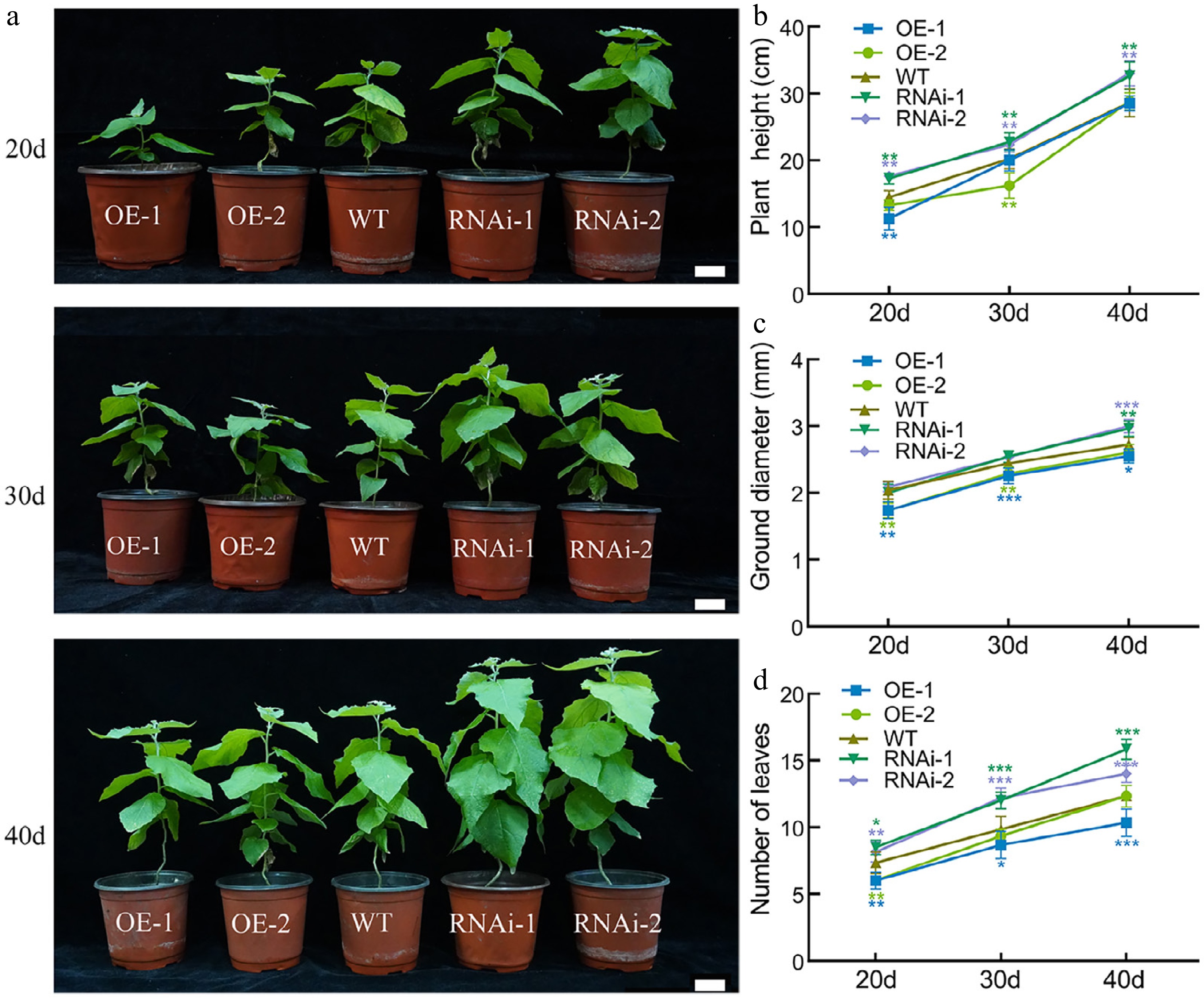 The growth status of PagbZIP60 transgenic poplar under normal conditions. (a) The growth status of PagbZIP60 transgenic poplar under normal conditions. (b) Plant height, (c) ground diameter, and (d) number of leaves of PagbZIP60 transgenic poplar at different developmental stages. The stars indicate significant differences between PagbZIP60 transgenic poplar and non-transgenic poplar at the same developmental stage (p < 0.05), * p < 0.05, * m p < 0.01, *** p < 0.001. The plot represents the mean ± SD (n = 6). OE: PagbZIP60 overexpression lines, RNAi: PagbZIP60 suppression lines, WT: non-transgenic poplar. Scale bars, 1 cm.