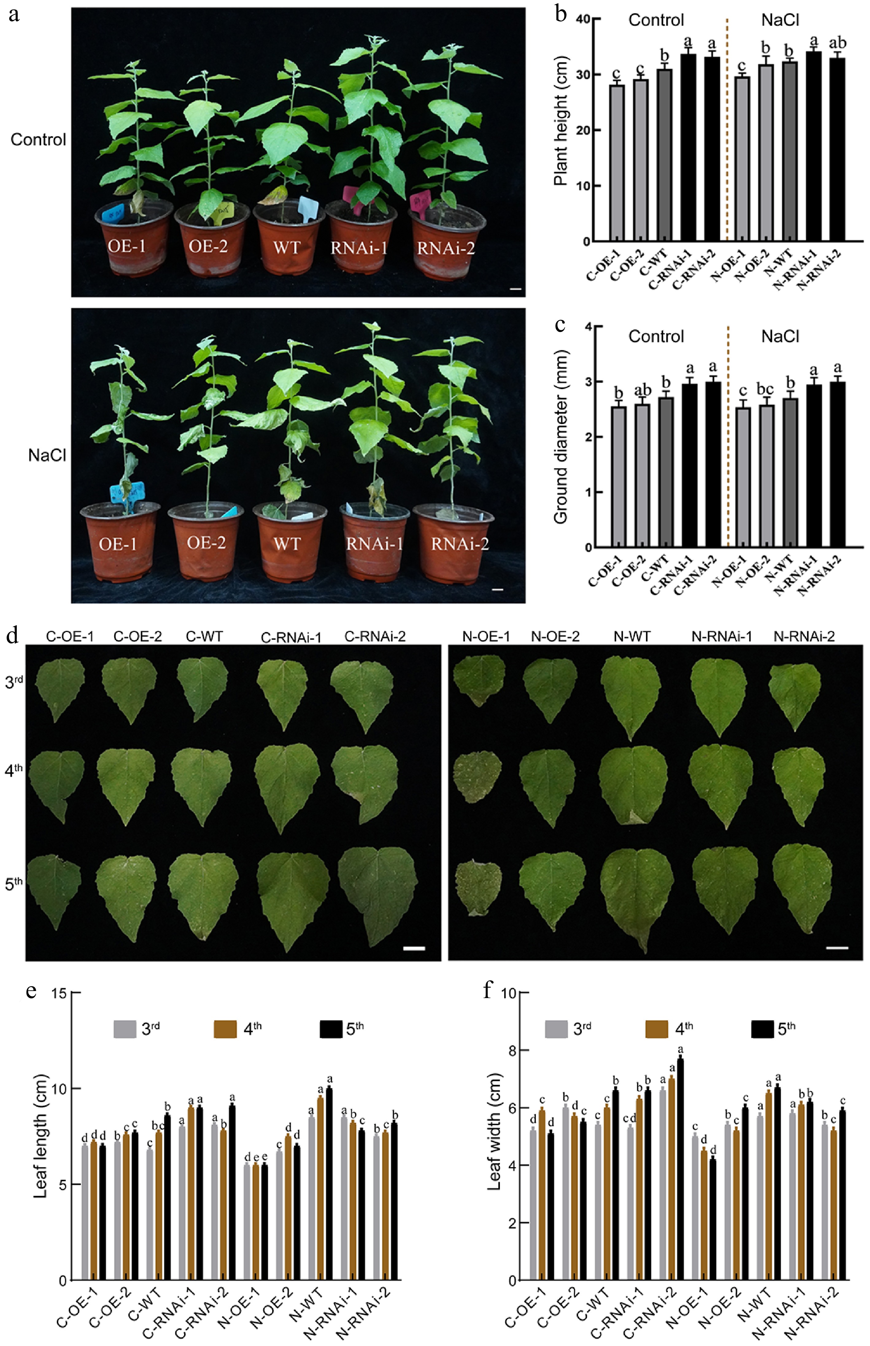 The growth status of PagbZIP60 transgenic poplar under salt stress (150 mM NaCl) conditions. (a) The growth status of PagbZIP60 transgenic poplar. (b) Plant height, and (c) ground diameter of PagbZIP60 transgenic poplar. (d) The status of mature functional leaves of PagbZIP60 transgenic poplar. (e) Leaf length, and (f) leaf width of PagbZIP60 transgenic poplar. The different lowercase letters indicate significant differences among samples (p < 0.05). The plot represents the mean ± SD (n = 6). OE: PagbZIP60 overexpression lines, RNAi: PagbZIP60 suppression lines, WT: non-transgenic poplar, C: normal control growth condition, N: salt stress with NaCl condition. C-OE-1 represents overexpression line 1 under normal conditions; N-OE-1 represents the same line under salt stress. The same nomenclature applies to other abbreviations. Bars: 1 cm.