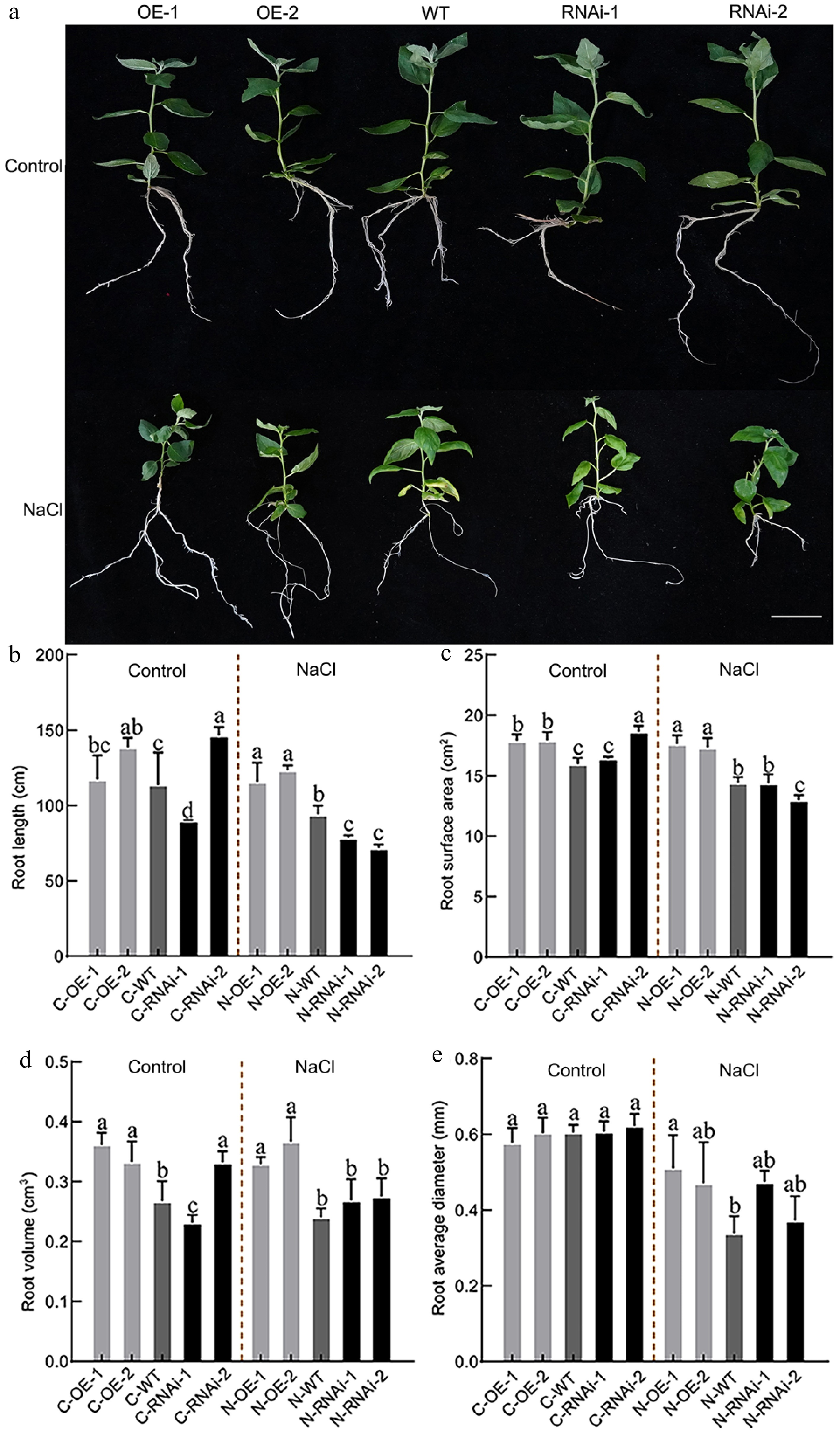 Root system phenotype analysis of PagbZIP60 transgenic poplar under salt stress. (a) The root status of PagbZIP60 transgenic poplar grown in the 1/2 MS medium containing 50 mM NaCl for 30 d. (b) Total root length, (c) root surface area, (d) root volume, and (e) average diameter of PagbZIP60 transgenic poplar in the 1/2 MS media containing 50 mM NaCl for 30 d. The different lowercase letters indicate significant differences among samples (p < 0.05). The plot represents the mean ± SD (n = 6). OE: PagbZIP60 overexpression lines, RNAi: PagbZIP60 suppression lines, WT: non-transgenic poplar, C: normal control growth condition, N: salt stress with NaCl condition. C-OE-1 represents overexpression line 1 under normal conditions; N-OE-1 represents the same line under salt stress. The same nomenclature applies to other abbreviations. Bars: 1 cm.