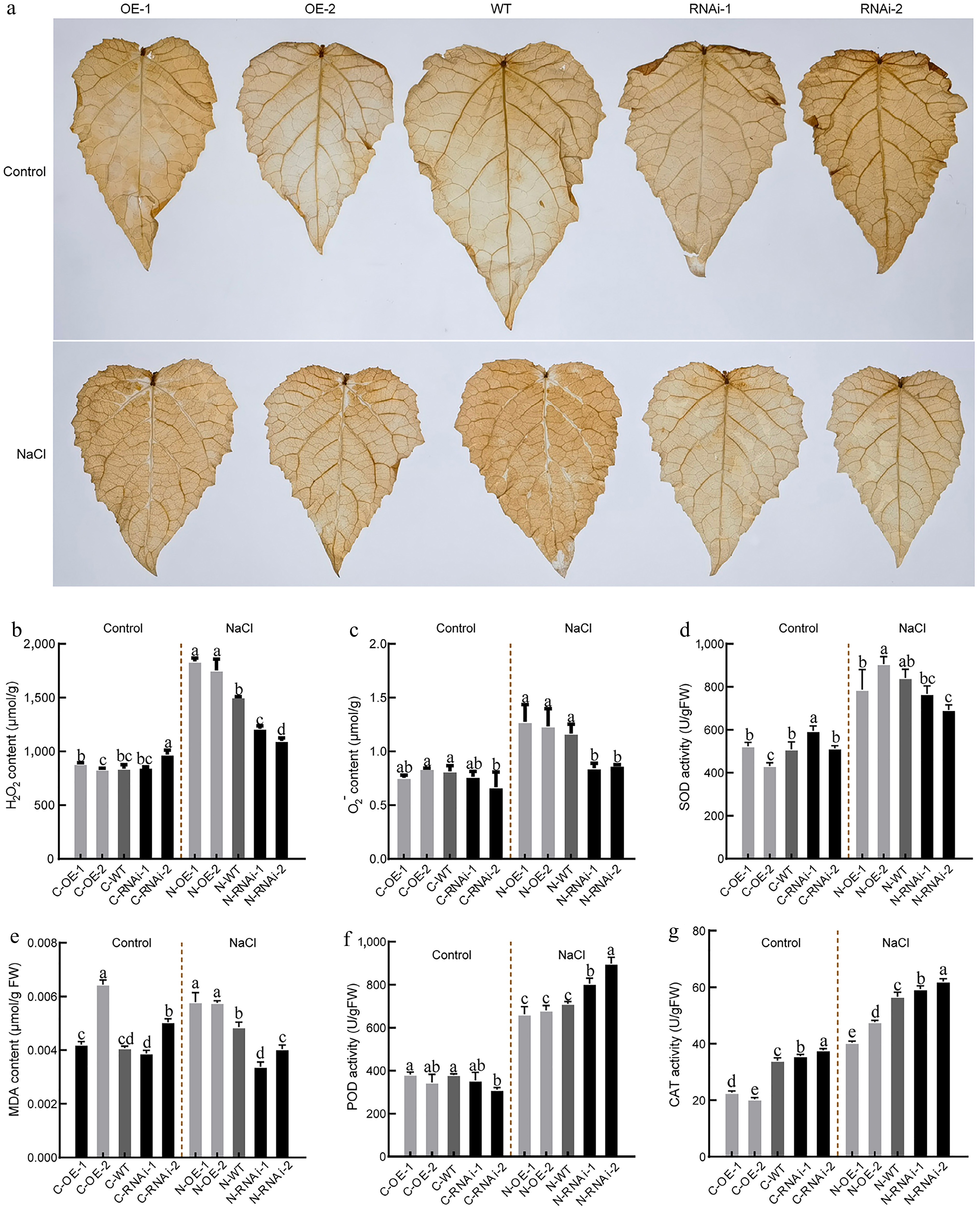 Antioxidative physiological indices in PagbZIP60 transgenic poplar under salt stress. (a) Diaminobenzidine (DAB) histological staining of the mature functional leaves of PagbZIP60 transgenic poplar grown in the pots with 150 mM NaCl for 10 d. (b) Hydrogen peroxide (H2O2), and (c) superoxide anion O2) content of the mature functional leaves. (d) Superoxide (SOD), (e) malondialdehyde (MDA) content, (f) peroxidase (POD), and (g) catalase (CAT) activities. The different lowercase letters indicate significant differences among samples (p < 0.05). The plot represents the mean ± SD (n = 6). OE: PagbZIP60 overexpression lines, RNAi: PagbZIP60 suppression lines, WT: non-transgenic poplar, C: normal control growth condition, N: salt stress with NaCl condition. C-OE-1 represents overexpression line 1 under normal conditions; N-OE-1 represents the same line under salt stress. The same nomenclature applies to other abbreviations.
