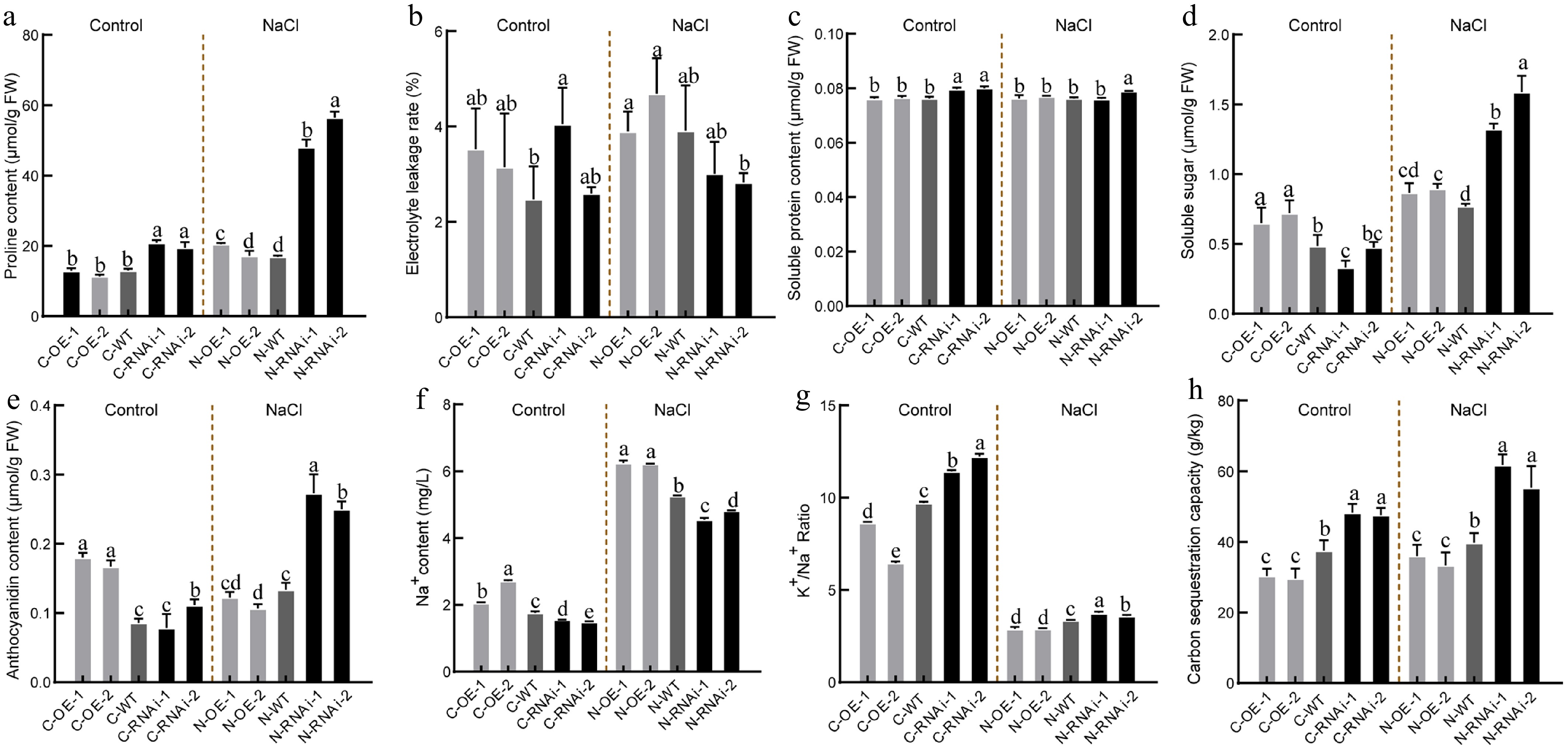 Osmotic regulation, ion balance and carbon fixation capacity under salt stress in PagbZIP60 transgenic poplar. (a) Proline content, (b) electrolyte leakage, (c) soluble protein content, (d) soluble sugar content, and (e) anthocyanins content. (f) The contents of Na+ and (g) ratio of K+ to Na+. (h) Carbon sequestration capacity of whole plants detected by 20 biological replicates per line. The different lowercase letters indicate significant differences among samples (p < 0.05). The plot represents the mean ± SD (n = 6). OE: PagbZIP60 overexpression lines, RNAi: PagbZIP60 suppression lines, WT: non-transgenic poplar, C: normal control growth condition, N: salt stress with NaCl condition. C-OE-1 represents overexpression line 1 under normal conditions; N-OE-1 represents the same line under salt stress. The same nomenclature applies to other abbreviations.
