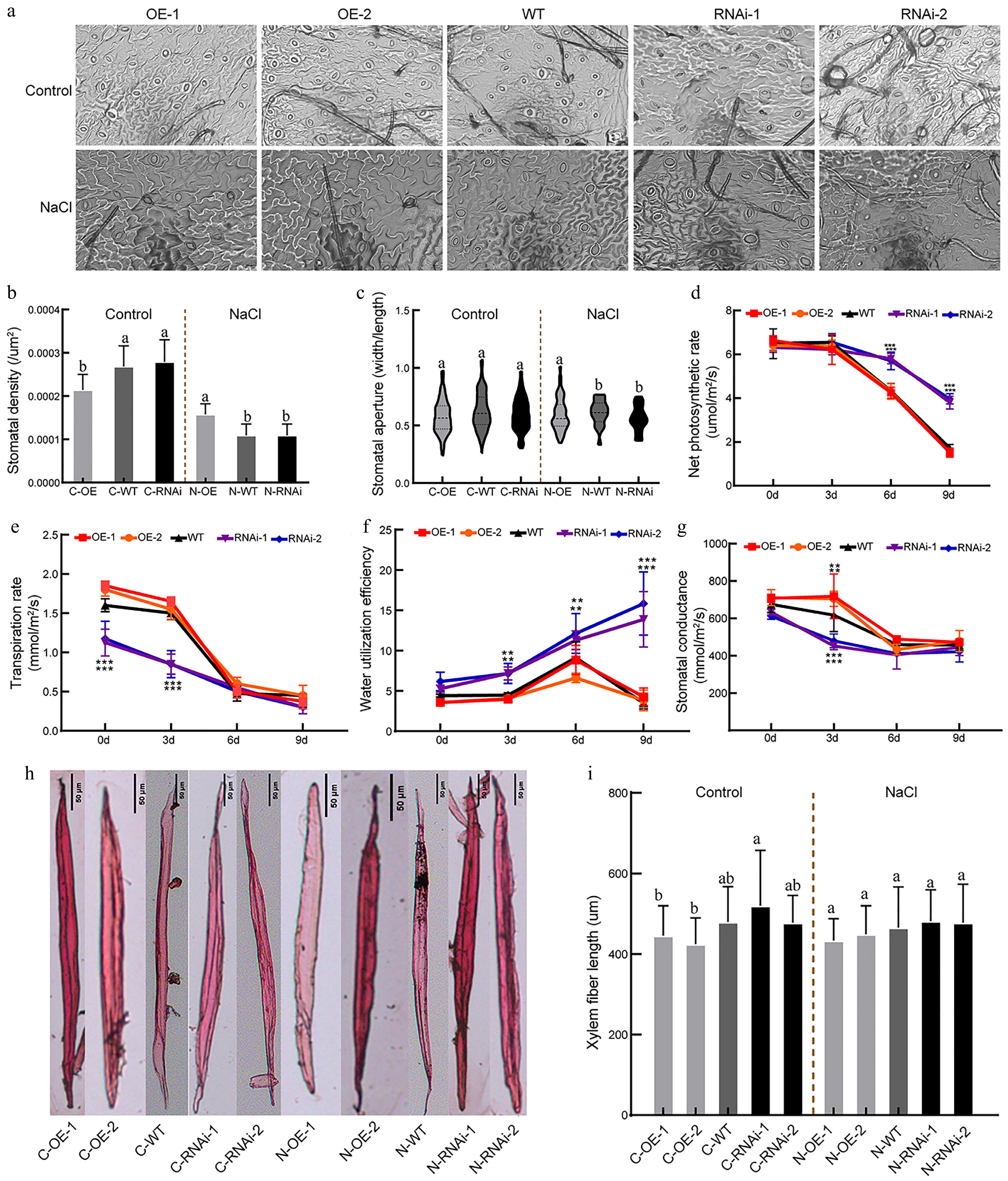 Analysis of stem anatomy revealed that under control conditions, the wood fiber lengths in the OE-1 and OE-2 lines were shorter by approximately 4.84% and 0.55% relative to WT (Fig. 7h, i), but those in RNAi-1 and RNAi-2 lines were approximately 4.83% and 0.18% longer, respectively. This pattern remained stable under salt stress. Unfortunately, none of these differences achieved statistical significance, and paraffin section analysis of stem cross-section revealed no significant differences among lines (Supplementary Fig. S4).