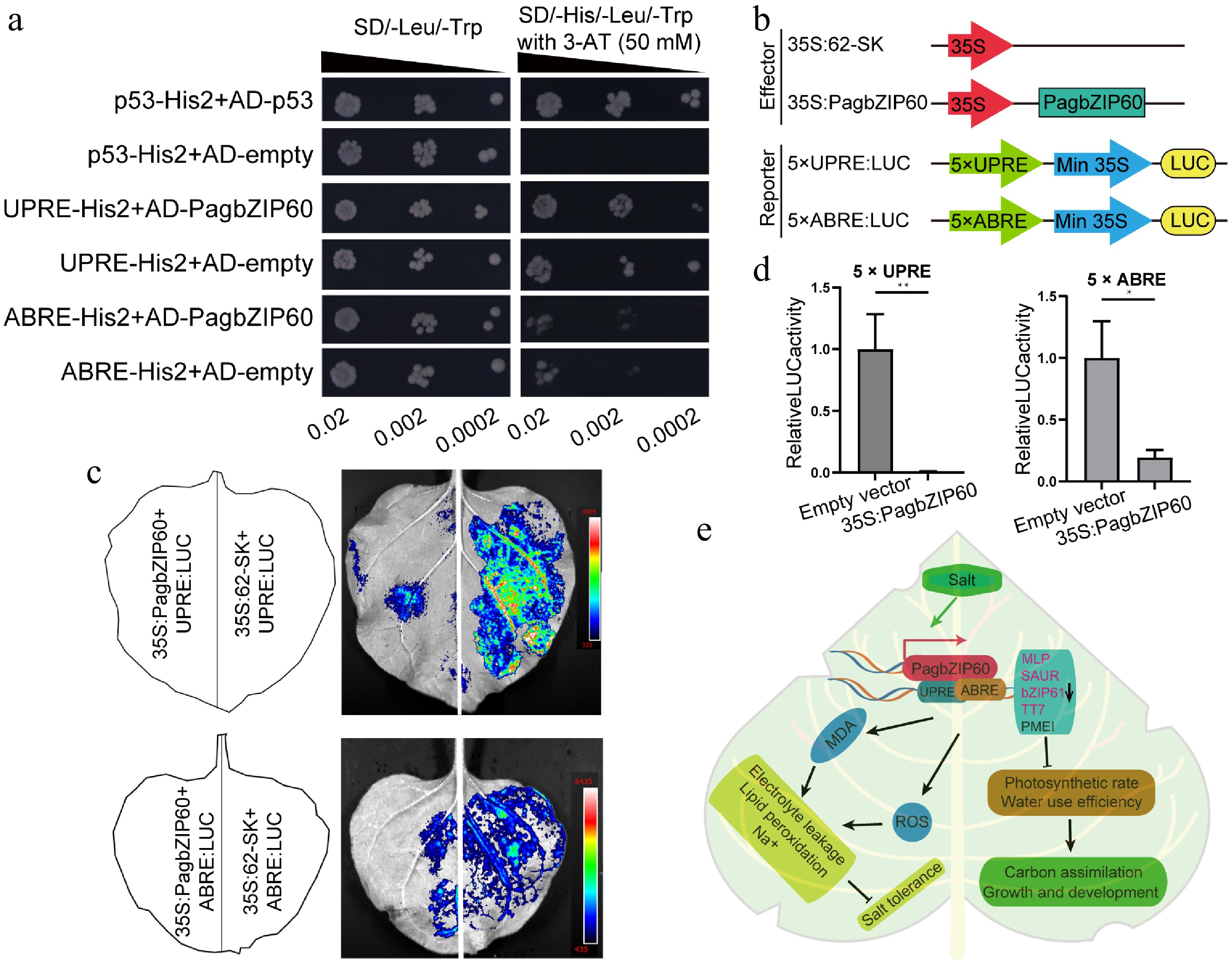 Downstream targets regulated by PagbZIP60. (a) The binding of PagbZIP60 to UPRE/ABRE motifs was validated using a Y1H assay. Transformed yeast dilutions were plated on synthetic dextrose (SD) media lacking leucine and tryptophan (SD/-Leu/-Trp), and on SD media lacking leucine, tryptophan, and histidine (SD/-His/-Leu/-Trp), with 3-AT (3-amino-1,2,4-triazole). Positive control: p53-His2 + AD-53; Negative control: p53-His2 + AD-empty, UPRE-His2 + AD-empty, ABRE-His2 + AD-empty. (b) PagbZIP60 and five iterations of cis-elements (UPRE/ABRE) were fused to pGreenII 62-SK and pGreenII 0800-LUC vector, respectively. (c) Dual luciferase assays of PagbZIP60 and (d) cis-elements (UPRE/ABRE) by transient expression in tobacco leaves. (e) A model of the mechanism by which PagbZIP60 regulates salt tolerance and carbon assimilation by impairing ROS scavenging and ion homeostasis in poplar. The error bars represent the standard deviation of three biological replicates (n = 3). Statistical significance was determined by one-way ANOVA followed by Tukey's post hoc test. Asterisks denote statistically significant differences (p < 0.05), * p < 0.05, ** p < 0.01, *** p < 0.001.