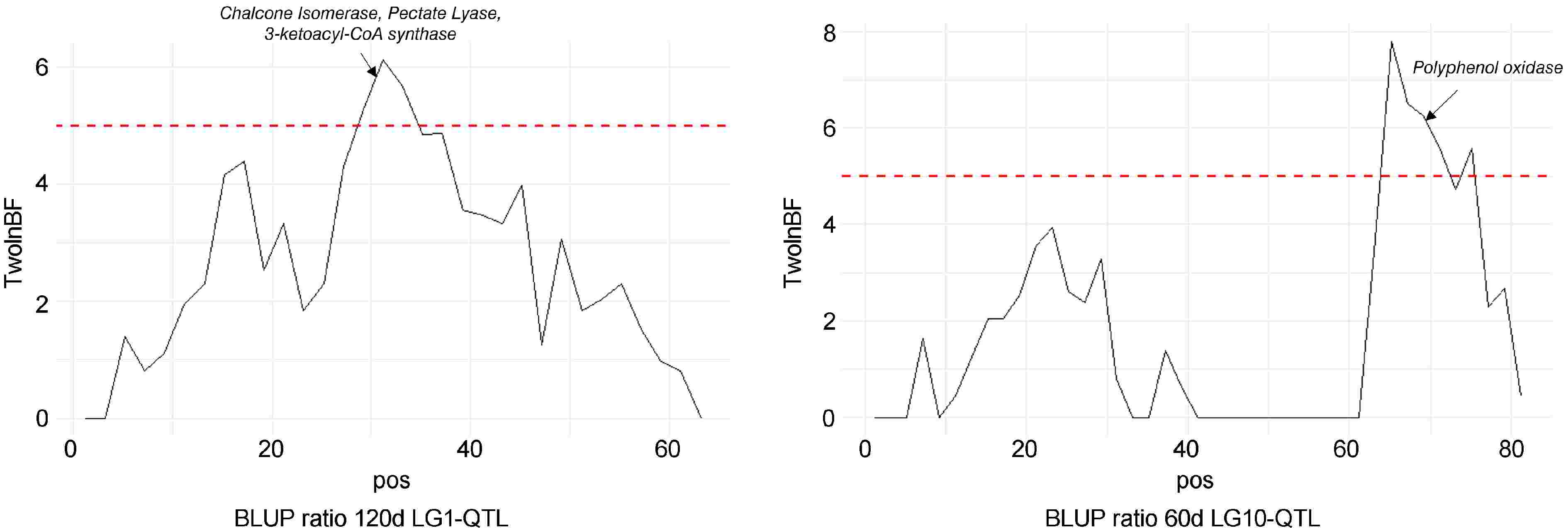 LG1-QTL mode colocalized (Fig. 6) with four Chalcone Isomerase (MdCHI) genes (MD01G1117800, MD01G1118000, MD01G1118100, MD01G1118300), a Pectate lyase (Md01G119400) and 3-ketoacyl- CoA synthase genes (MD01G1118800, MD01G1119200, MD01G1119300). LG10-QTL mode colocalized (Fig. 6) with a genetic region containing five PPO genes (MD10G1298200, MD10G1298300, MD10G1298400, MD10G1298500, MD10G1298700).