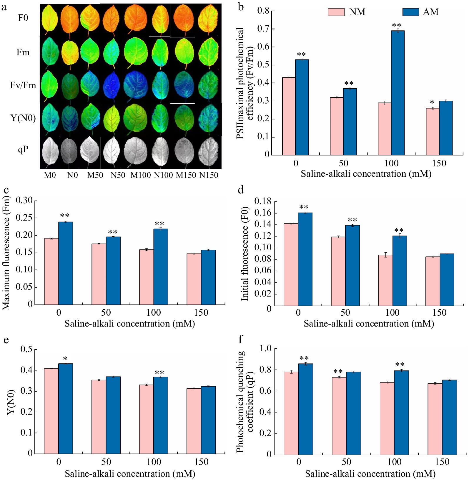 Effect of AMF on fluorescence parameter of M9-T337 leaves under saline-alkali stress. NM (Inoculation with AMF); AM (Uninoculation with AMF). (a) Chlorophyll fluorescence imaging. (b) Fv/Fm, PSIImaximal photochemical efficiency. (c) Fm, maximum fluorescence. (d) F0, initial fluorescence. (d) Y(N0), quantum yield of unregulated energy dissipation. (f) qP, photochemical quenching coefficient. * Represents a significant correlation at the 0.0.5 level; ** represents a highly significant correlation at the 0.01 level (Student's t-test).