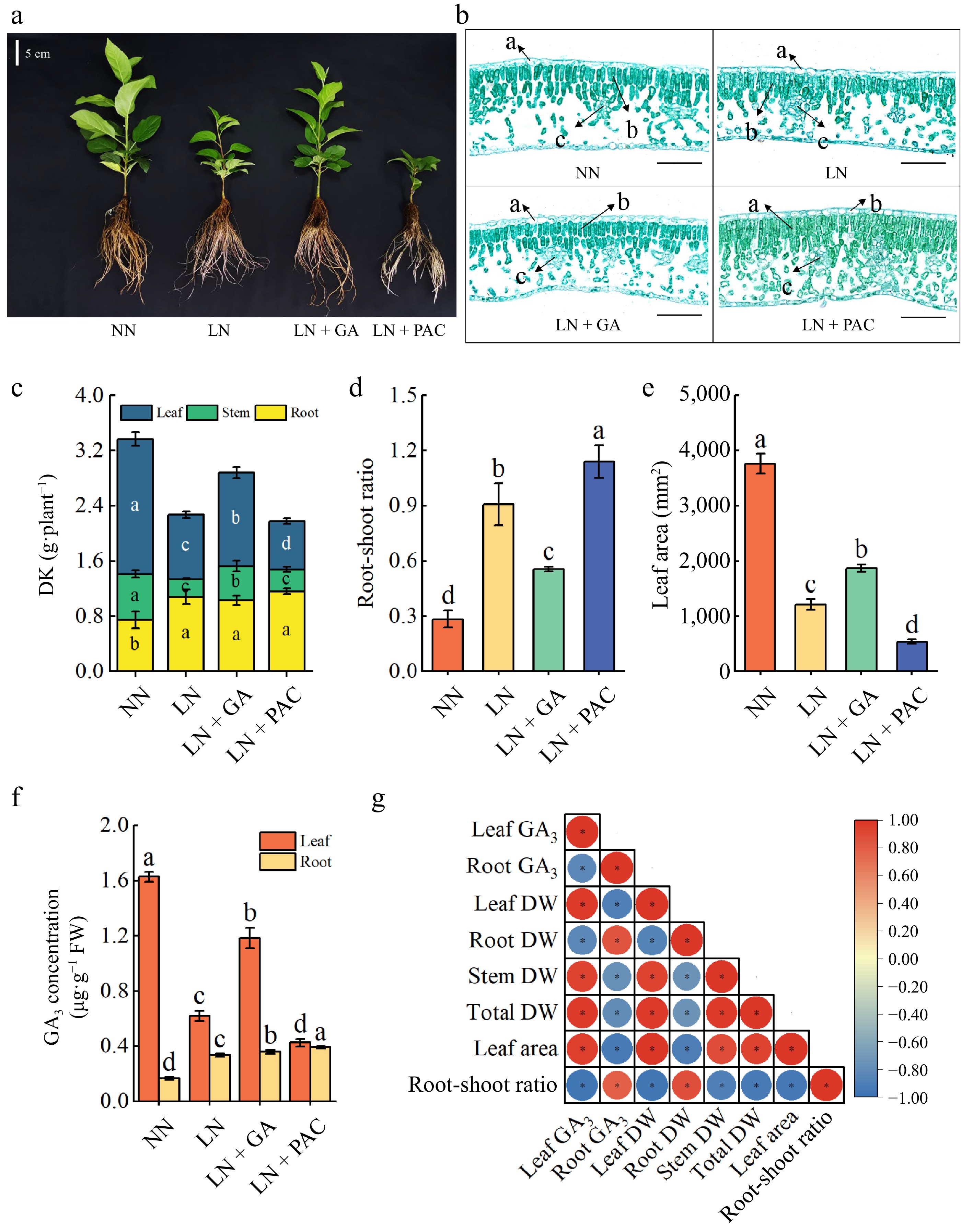Effects of exogenous GA3 and PAC on the (a) growth, (b) leaf anatomical structure, (c) dry weight, (d) root-shoot ratio, (e) leaf area, and (f) endogenous GA3 concentration of apple rootstocks under low-N stress, and (g) correlation analysis. In (b), 'a' represents epidermis, 'b' represents palisade tissue, 'c' represents vascular bundle, and the scale is 100 μm. DW: dry weight; NN: plants under normal N supply (5 mM NO3−); LN: plants under low N supply (0.5 mM NO3−); GA: GA3; PAC: paclobutrazol. Vertical lines indicate the standard deviation (± SD) for a sample size of n = 5. The presence of different letters indicates a statistically significant difference at the 5% level (p < 0.05).