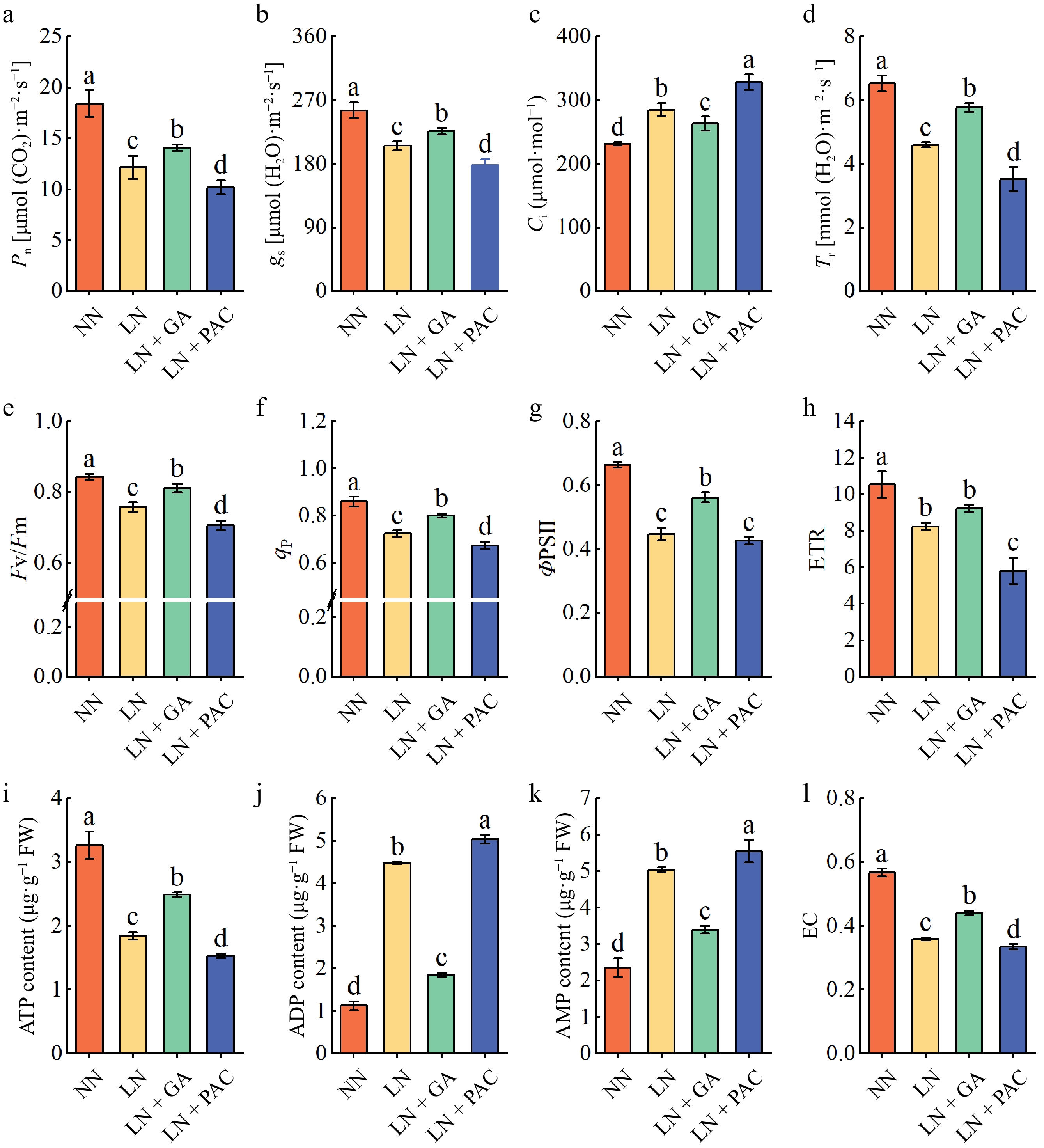 The ATP, ADP, AMP, and EC contents provide a direct indication of a plant's energy utilization status. In comparison to the NN treatment, the LN treatment resulted in a notable reduction in ATP content and EC, while significantly increasing the ADP and AMP contents (Fig. 2i−l). Exogenous GA3 treatment significantly increased ATP content and energy charge (EC) in LN plants, whereas PAC had the opposite effect.