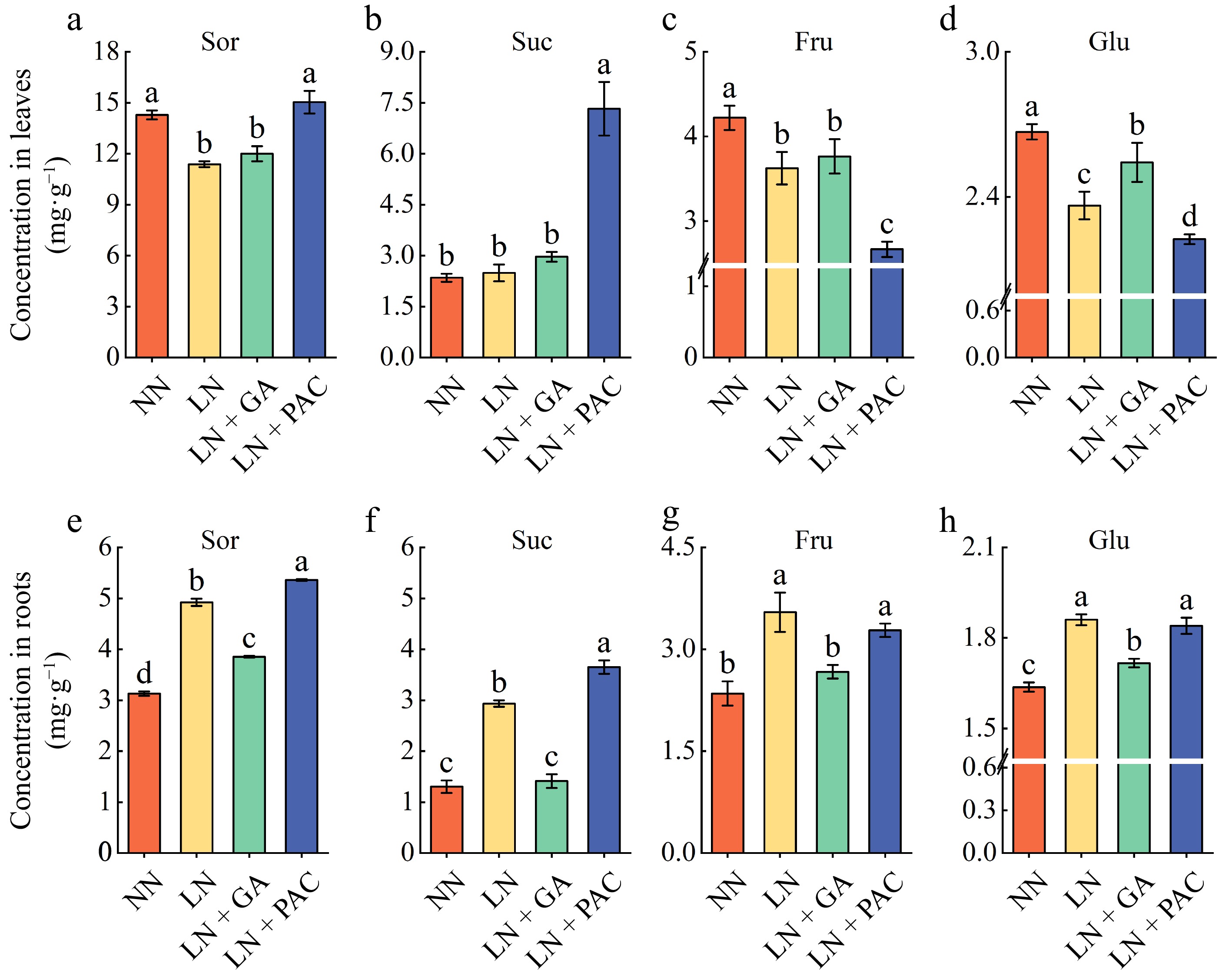 Sucrose (Suc), sorbitol (Sor), fructose (Fru), and glucose (Glu) were the main soluble sugars in the rootstock seedlings. In comparison to the NN treatment, the levels of soluble sugars in the leaves were markedly diminished under the LN treatment, except for Suc (Fig. 3). Exogenous GA3 application led to a significant increase in Glu concentration in the leaves of LN plants, while no notable effect was observed on the other three soluble sugars. In the roots, the levels of all four soluble sugars in the LN + GA treatment were markedly lower compared to the LN treatment. Additionally, PAC treatment significantly increased Suc and Sor content but significantly decreased Fru and Glu content in the leaves of LN plants.