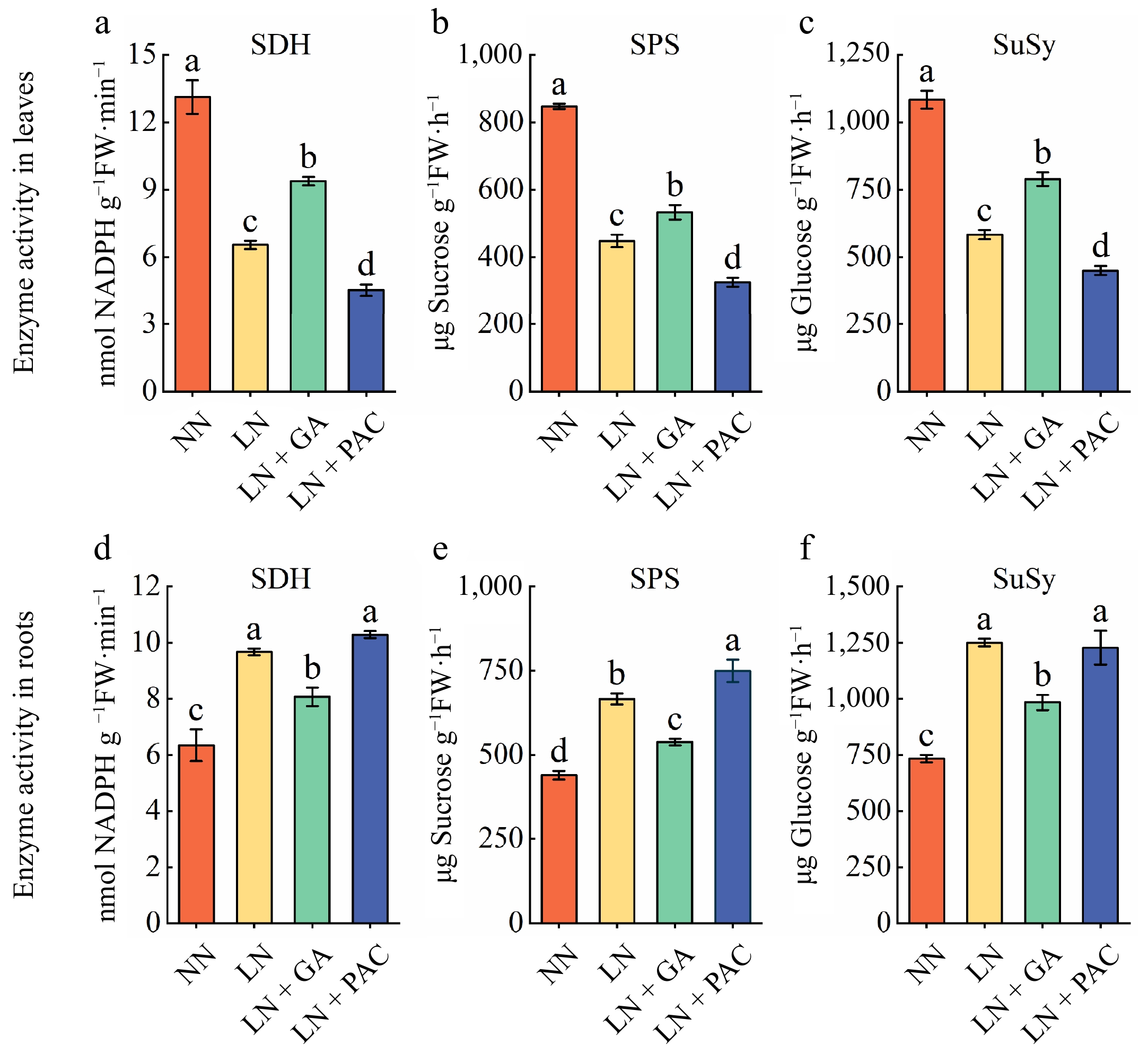 SPS and SuSy catalyze the synthesis and degradation of Suc, while SDH catalyzes the degradation of Sor. In comparison to the NN treatment, the activities of SDH, SPS, and SuSy were significantly decreased in the leaves but significantly increased in the roots of plants subjected to LN treatment (Fig. 4). The LN + GA treatment significantly elevated the activities of SDH, SPS, and SuSy in the leaves of LN plants but played the opposite role in the roots. In addition, PAC treatment further reduced the activities of the three sugar-metabolizing enzymes in the leaves of LN plants but had no significant influence on SDH and SuSy activities in the roots.