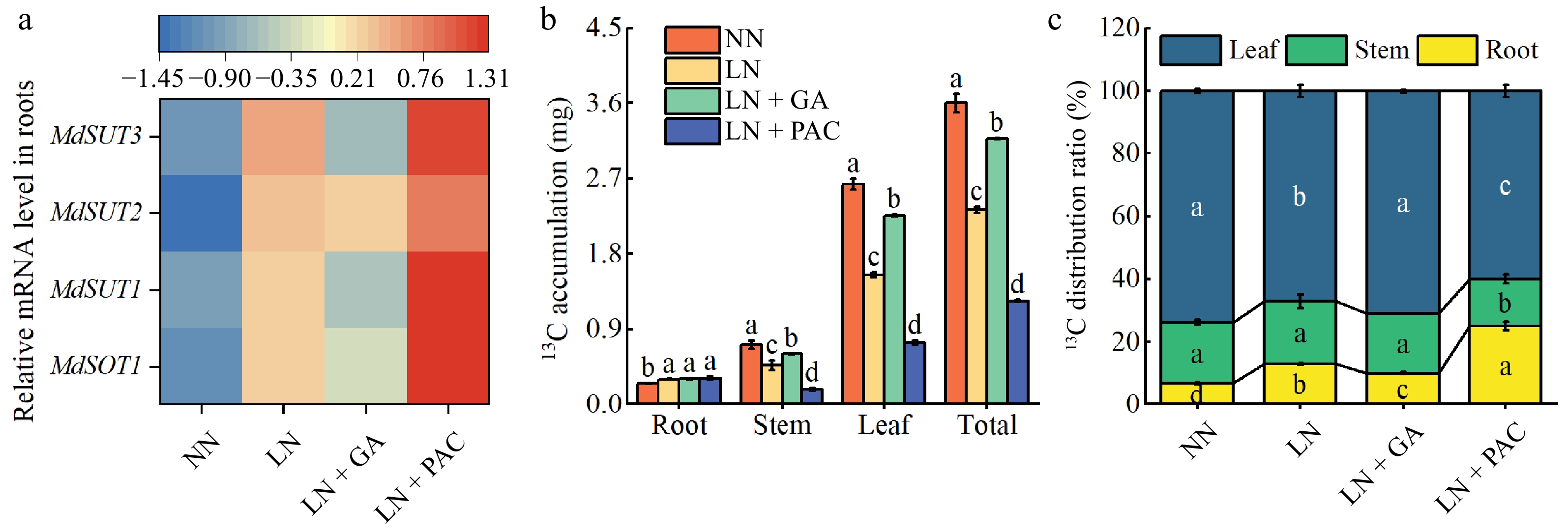 MdSOT1 and MdSUTs are involved in Sor and Suc unloading of from apple rootstock seedlings. In comparison to the NN treatment, the LN treatment resulted in an increase in expression of MdSOT1, MdSUT1, MdSUT2, and MdSUT3 (Fig. 5a). However, in contrast to the LN treatment, the application of GA3 decreased the expression of MdSOT1, MdSUT1, MdSUT2, and MdSUT3 in the roots, whereas the LN + PAC treatment increased their expression.