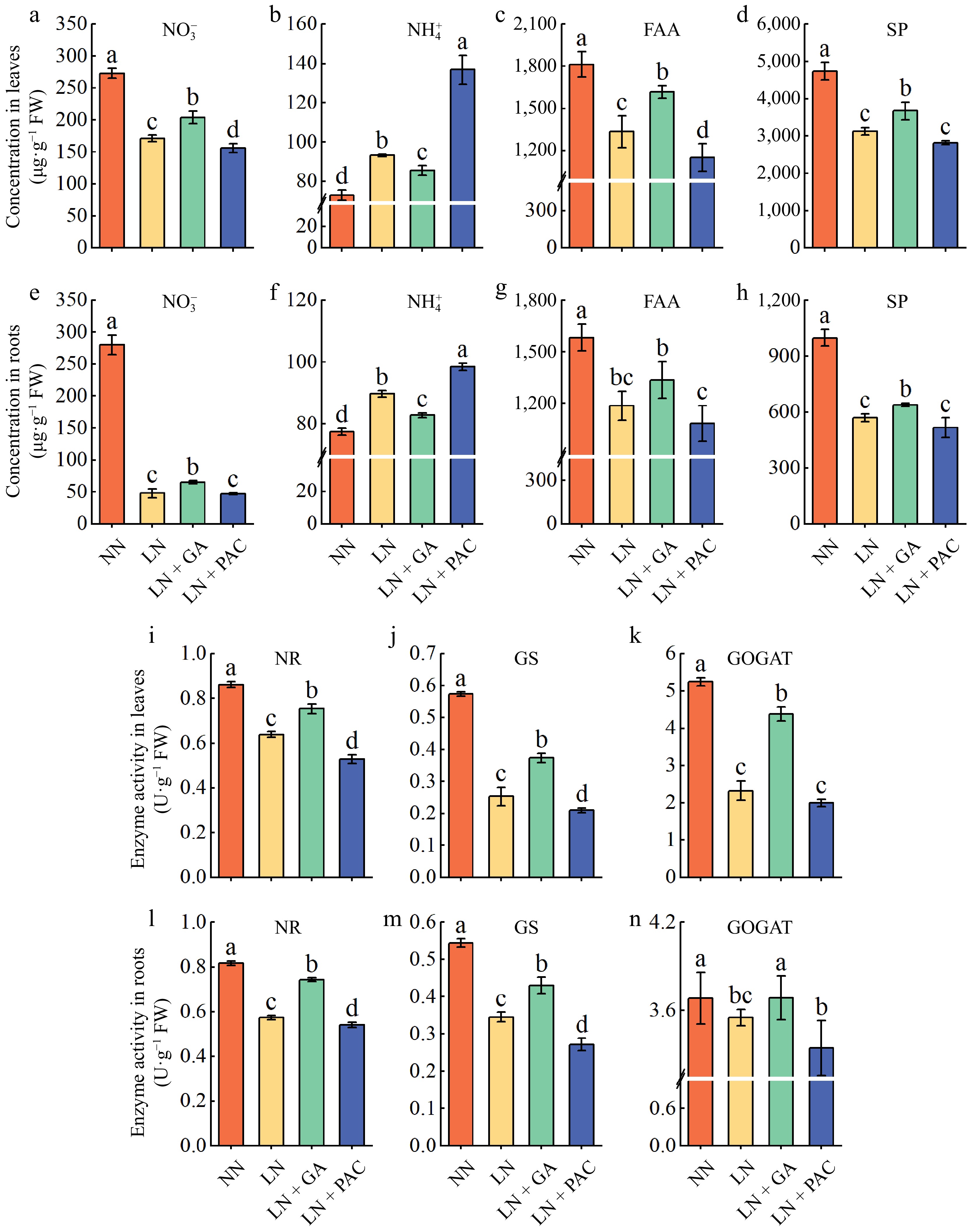 As shown in Fig. 6a−h, the LN treatment significantly decreased the concentrations of NO3−, FAA, and SP in plant leaves and roots compared to the NN treatment, but significantly increased the concentration of NH4+. In addition, spraying exogenous GA3 significantly increased NO3−, free amino acid (FAA), and soluble protein (SP) contents, and significantly decreased NH4+ contents in leaves and roots of plants under LN treatment, whereas spraying PAC produced the opposite effect.
