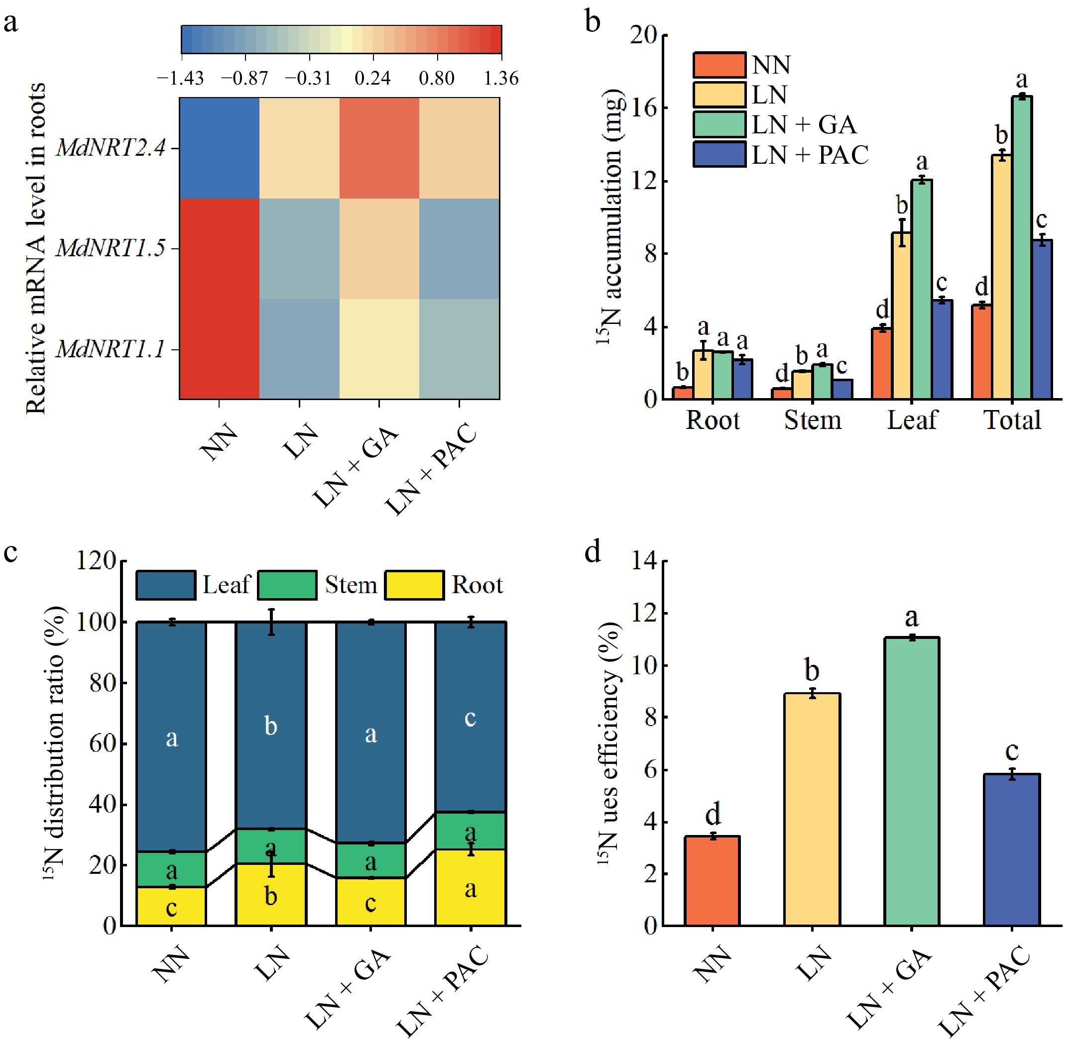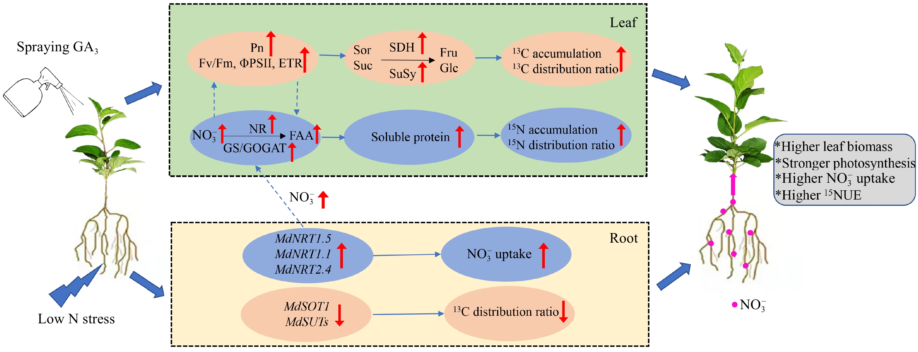 Liu J, Lyu M, Liu C, Ni W, Guan Y, et al. 2025. Exogenous GA3 alleviates low nitrogen stress by enhancing leaf nitrogen assimilation and limiting the transport of photosynthates to roots in apple plants. Fruit Research 5: e018 doi: 10.48130/frures-0025-0009