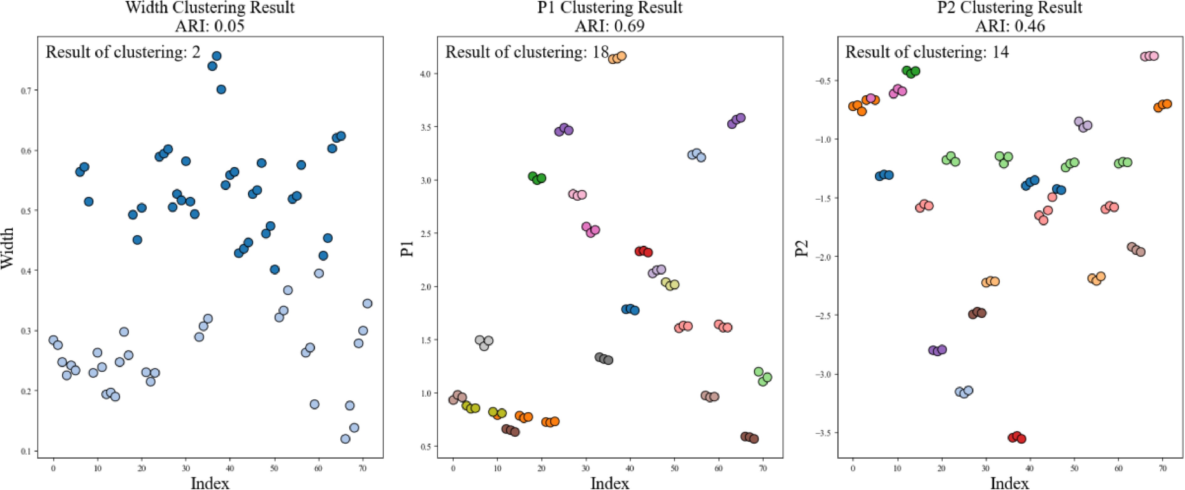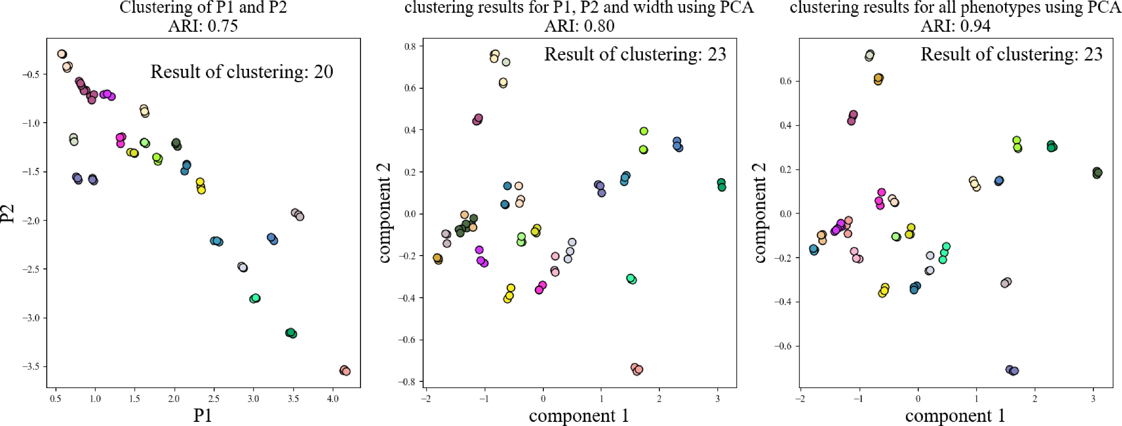 As shown in Fig. 11, we examined various combinations of phenotypic parameters for a more comprehensive clustering analysis. When the P1 and P2 values were subjected to two-dimensional automatic clustering, the number of identified varieties increased to 20, and the ARI improved to 0.75. By integrating crown width with the P1 and P2 values and applying principal component analysis (PCA), the number of varieties further increased to 23, achieving an ARI of 0.80. Although this result approached the expected 24 varieties, it indicated room for further improvement.