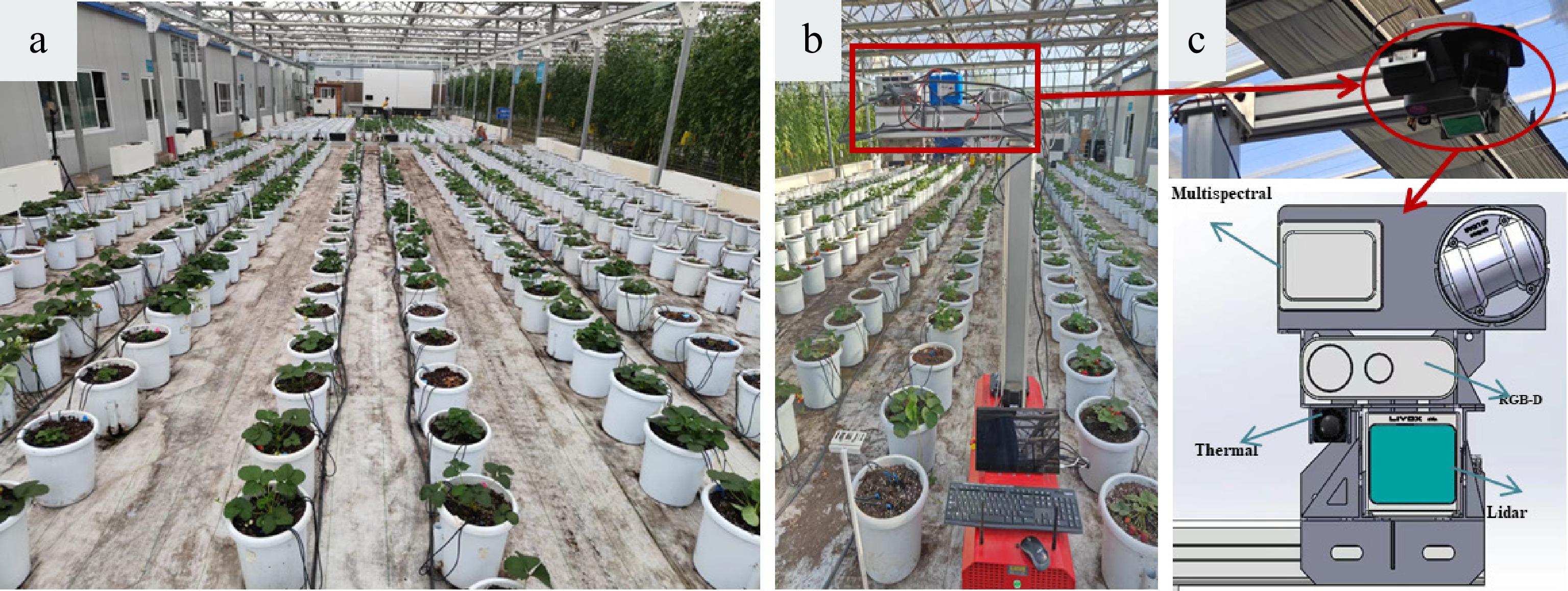 The experimental phase of this study was conducted in a linked greenhouse at the Beijing Academy of Agricultural and Forestry Sciences, Beijing, China (39°56' N, 116°16' E), a controlled environment tailored for advanced agricultural research. As shown in Fig. 2a, the strawberry cultivation area consisted of ten columns, each containing 36 pots, with three pots assigned to each variety, resulting in a total of 360 plants for phenotyping analysis. Data were collected on March 27, 2024, using a multi-source sensor system integrated into a robotic platform (Fig. 2b). This platform was designed to navigate between rows and capture high-quality phenotypic data across various environmental and plant parameters. Data were gathered from two columns of healthy strawberry plants, representing 72 pots and 24 distinct varieties, offering a diverse dataset for evaluating the system's robustness and scalability. The selection of 24 distinct strawberry varieties was based on the need to capture a diverse set of phenotypic traits across a range of genotypes. The operational procedures and technical specifications of the multi-source sensor system are outlined in Fig. 2c, which demonstrates the integration of RGB, infrared, and multi-spectral cameras, as well as a LiDAR sensor for precise data acquisition. For comparative performance evaluation, the UGV-LiDAR[5] system was also used to collect additional data on the same strawberry plants. This system allowed for the assessment of the proposed robotic platform's effectiveness in terms of data consistency, acquisition speed, and multi-dimensional phenotyping accuracy.
