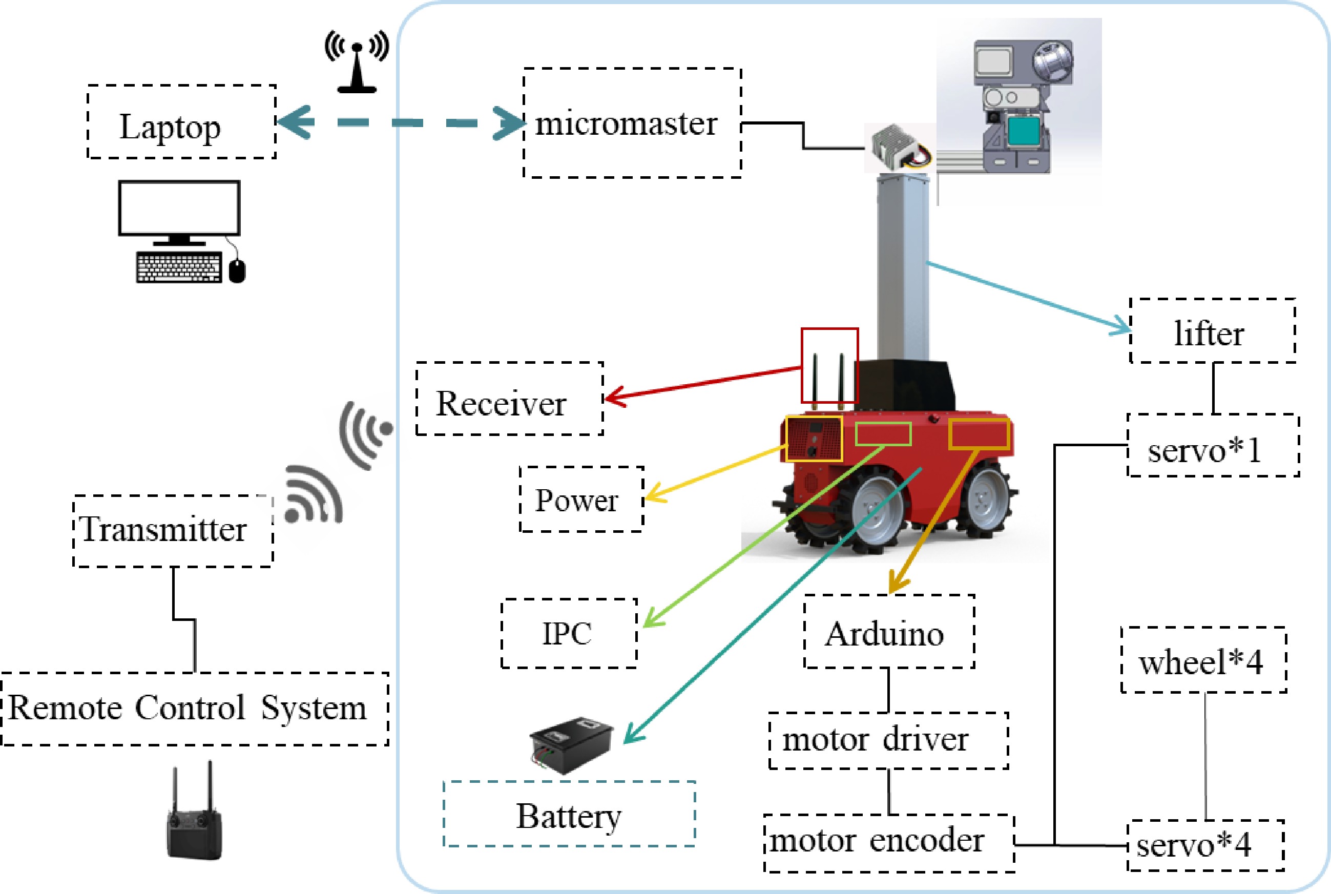 As illustrated in Fig. 3, the platform connects to an industrial personal computer (IPC) via a remote control system, allowing indirect control of the robot's movement and lift bar. Power is supplied to the microcontroller and LiDAR through a built-in lithium-ion battery using a 48 V to 12 V step-down module. A laptop connected to the same local area network (LAN) as the microcontroller enables remote data acquisition control. The platform employs a four-wheel-drive system, where each wheel is powered by an independent brushless motor and steered via a four-wheel differential mechanism. The differential ratio, defined as the speed difference between the right and left wheels, determines the turning radius; a higher differential ratio results in a smaller turning radius. The control module includes an Arduino control board, five encoders, and an industrial computer. This closed-loop system utilizes RS485 communication to regulate wheel movement, steering, and the lift bar's height adjustment.