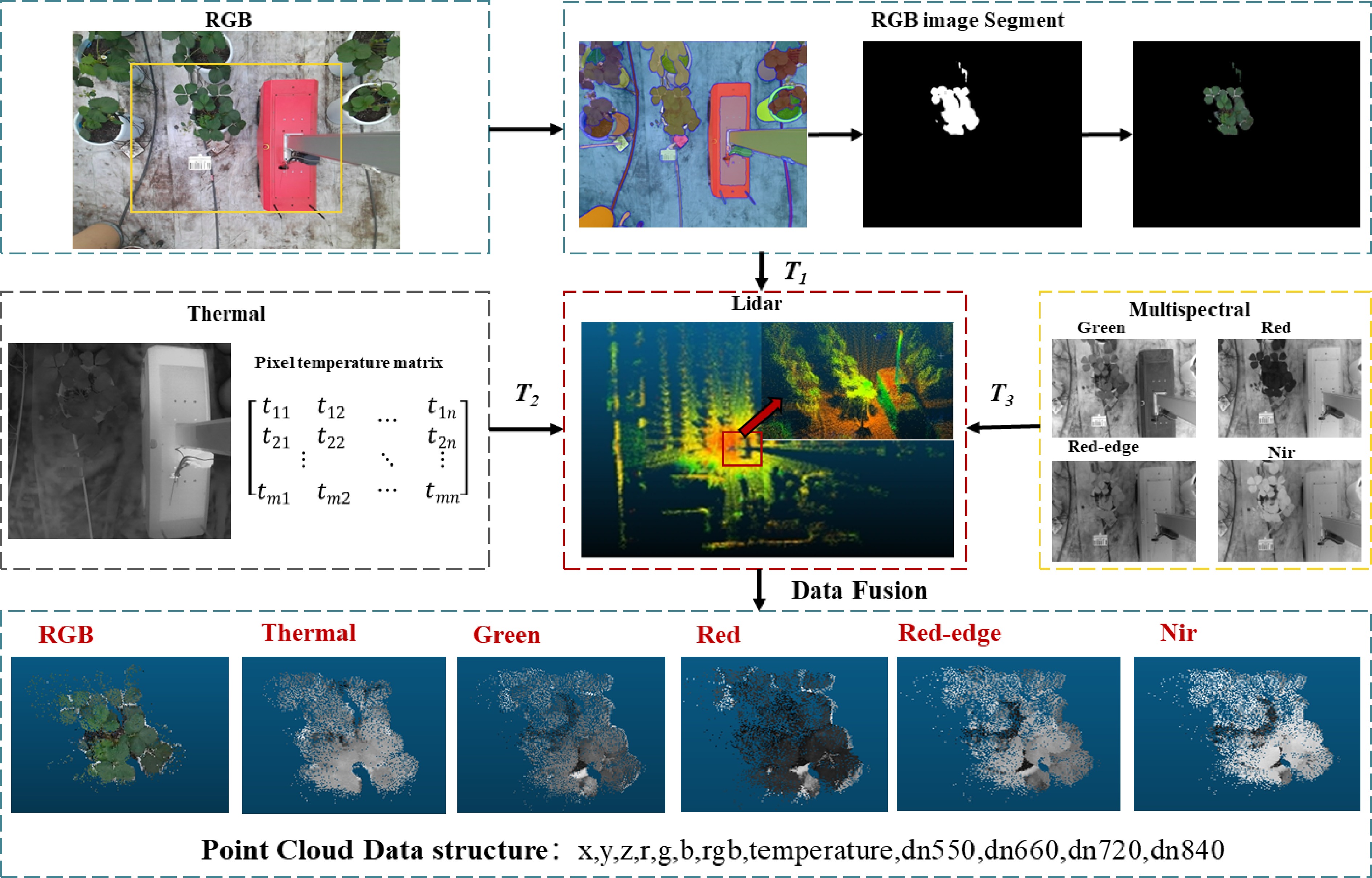 The comprehensive data fusion process, illustrated in Fig. 4, involves cameras with varying resolutions, fields of view, and coordinate systems. Using previously acquired external parameters, we standardize the camera data within the LiDAR coordinate system, enabling the fusion of positional, color, temperature, and spectral reflectance information. This methodology addresses challenges arising from the fusion of data from cameras with different resolutions, positional discrepancies, and variations in fields of view. To support this approach, we developed a standardized data structure capable of recording the fused multi-source sensor data, offering significant scalability to accommodate future sensor integrations.