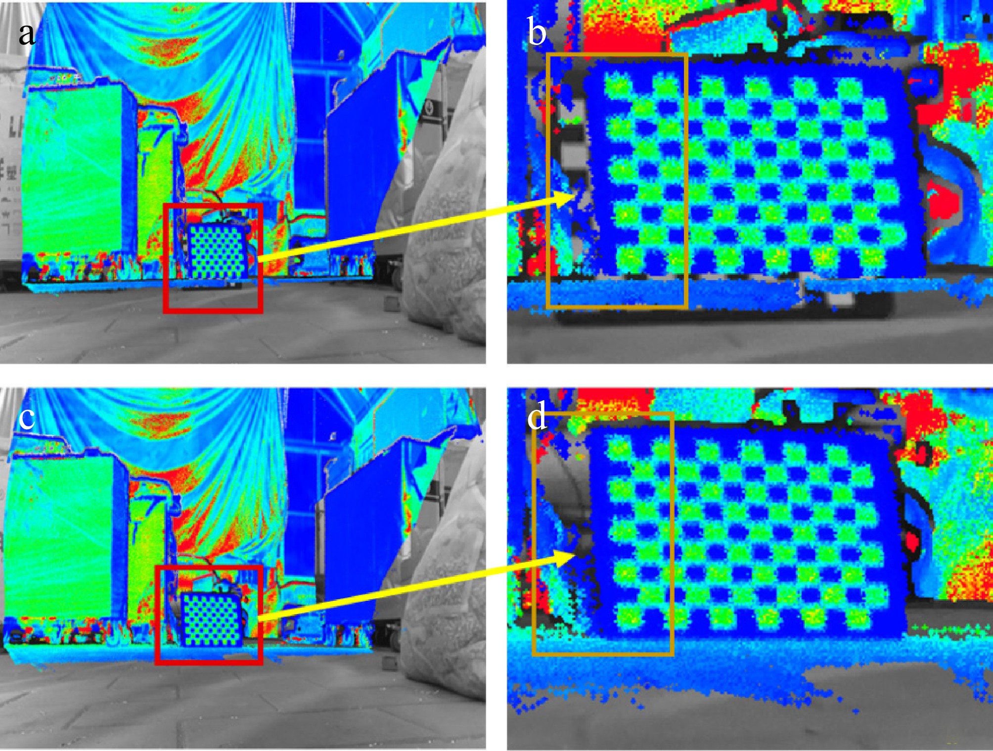We examined the external parameter between the green band lens of the multispectral camera and the LiDAR to demonstrate the optimization process. Initially, we projected the point cloud onto the image using the transformation matrix. During this projection, a noticeable offset appeared in the red-framed calibration plate (Fig. 5a). Figure 5b provides a magnified view of this region. After adjustments, the offset was nearly eliminated, as shown in Fig. 5c, with an enlarged view of the corrected area in Fig. 5d. This optimization process yielded more accurate external parameters, establishing a solid foundation for subsequent multi-source sensor data fusion. This improvement not only enhances the accuracy of data fusion but also supports further data analysis and processing.
