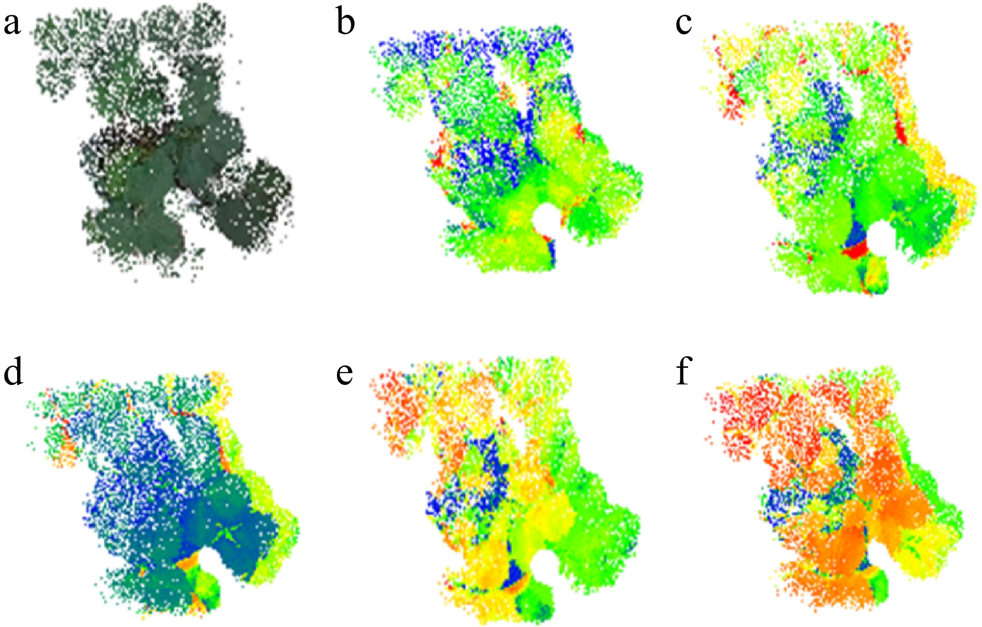Acquisition of plant ROI by RGB image segmentation after fusion of individual component point clouds: (a) RGB; (b) thermal; (c) green light band; (d) red light band; (e) red edge band; (f) NIR band.
