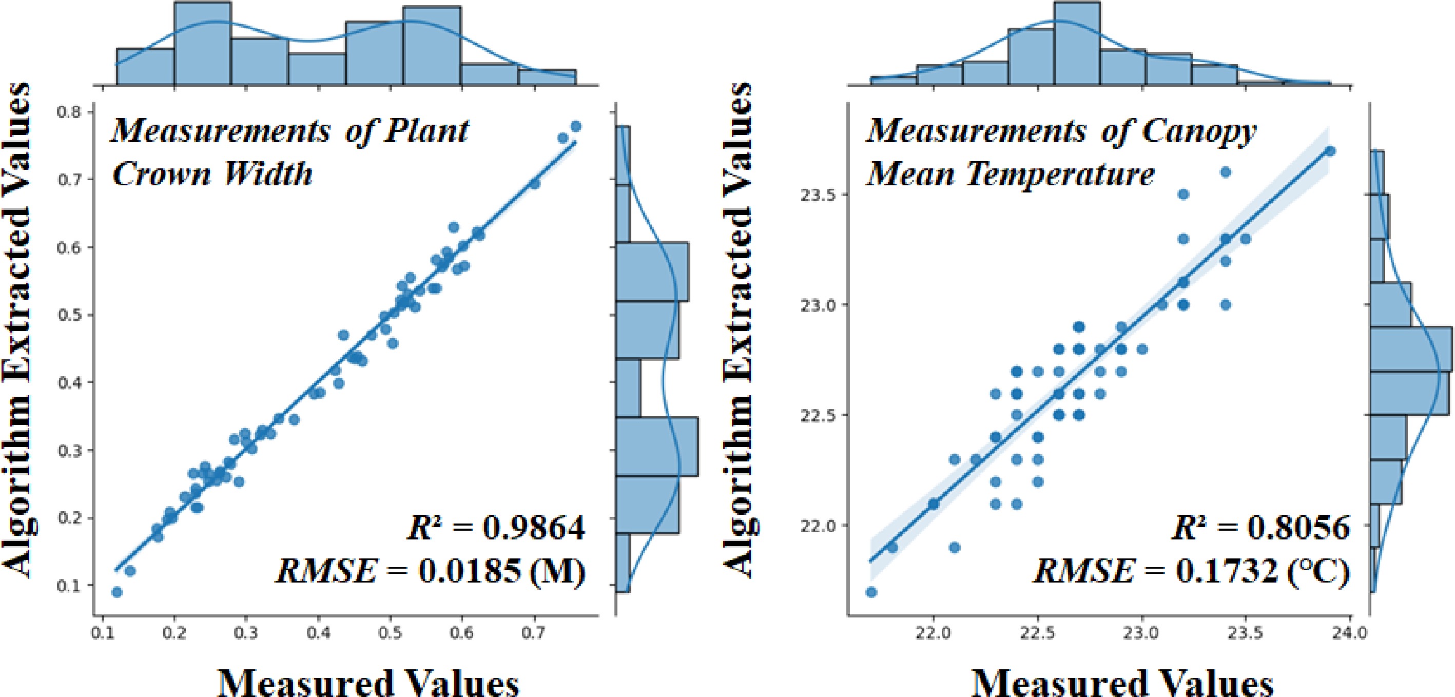 This study examined 72 strawberry plants, correlating the crown width and average temperature extracted from point clouds fused with multi-source sensor data with the corresponding manually measured values. A linear regression model was used for the analysis, with the horizontal axis representing manually obtained values and the vertical axis representing point cloud-derived values. The RMSE and R² were computed for both parameters. As shown in Fig. 7a, the algorithm's estimate of crown width demonstrated high accuracy, with an R² value of 0.9864 and an RMSE of 0.0185 m. In contrast, as shown in Fig. 7b, the estimate of average temperature exhibited lower accuracy, with an R² value of 0.8324 and an RMSE of 0.1732 °C. Despite this, the linear correlation between the manually measured and algorithm-derived crown widths remained strong, indicating that our methodology can reliably estimate strawberry crown dimensions. However, the relatively high RMSE in the algorithmic temperature measurements compared to the actual values may be due to the averaging process used for the temperature readings of the potted strawberries and their surrounding environment, which likely introduced some error.