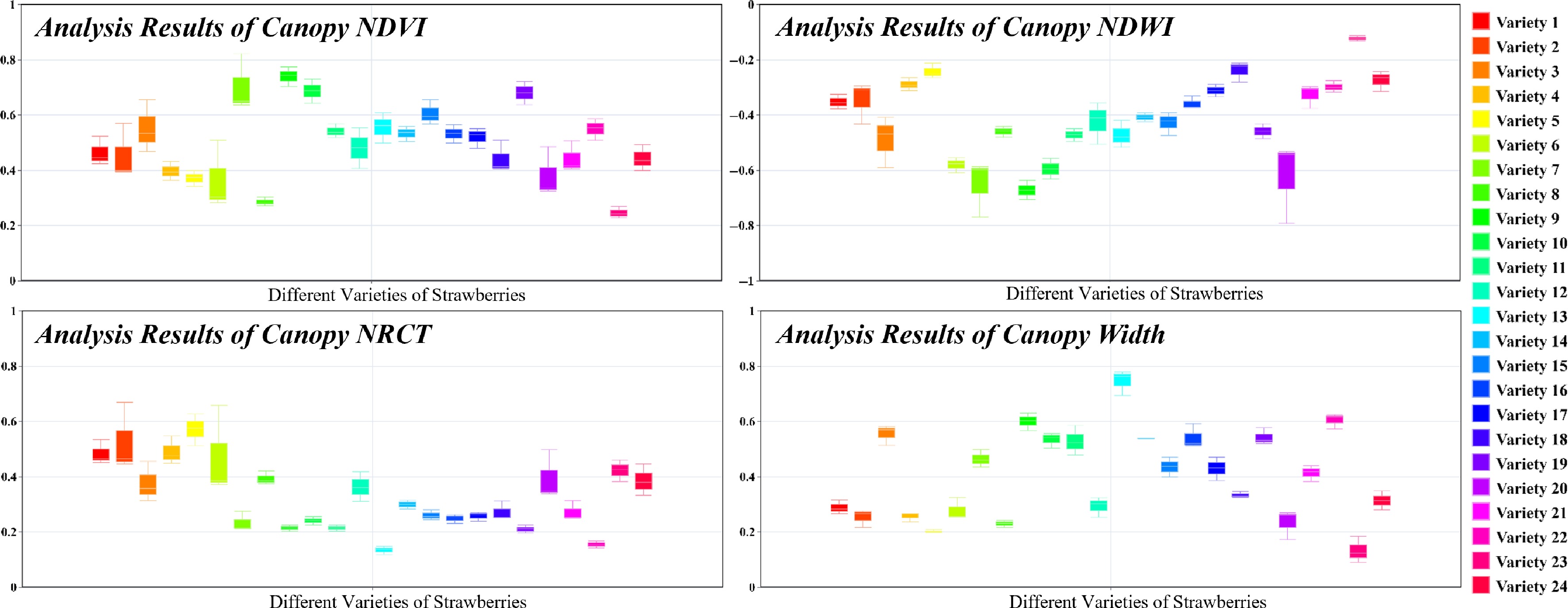 To validate the multi-dimensional phenotypic indices of plants, we classified them into four distinct types: canopy width, Normalized Difference Water Index (NDWI), Normalized Difference Vegetation Index (NDVI), and Normalized Relative Canopy Temperature (NRCT), along with two ratio indices, P1 and P2. The P1 and P2 values are comprehensive indices used to assess the water regulation capacity and overall plant health of strawberry varieties. These indices were used to analyze variations in water availability and overall plant health across different species.