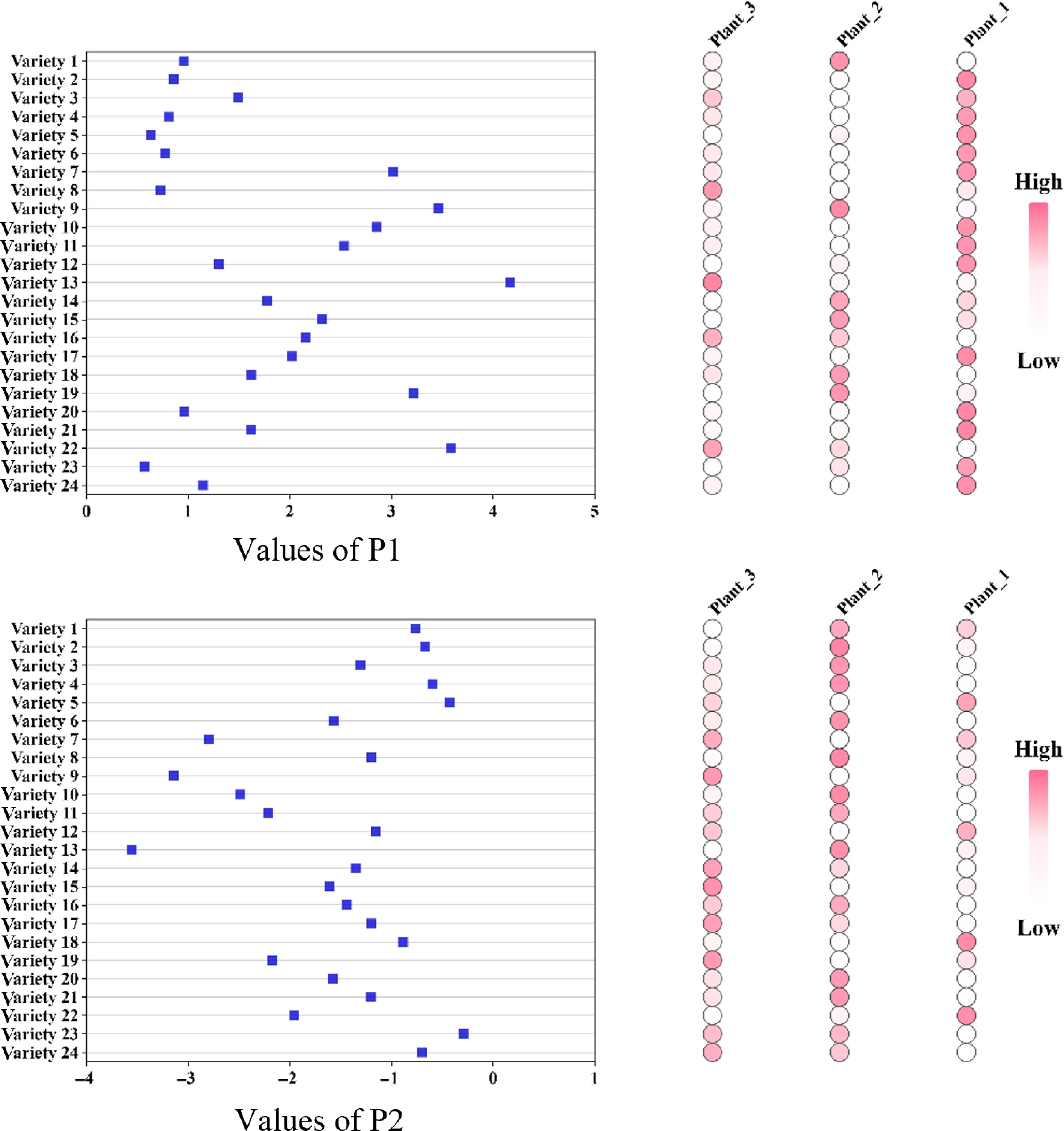 A higher P1 value combined with a lower P2 value indicates superior performance in both aspects. As shown in Fig. 9, significant differences in the mean P1 and P2 values were observed across varieties, highlighting variability in water-use efficiency and health status. Analysis of the distribution on the left side of Fig. 9 reveals that variety 13 exhibited the highest P1 value and the lowest P2 value, suggesting optimal water regulation and plant health. The weight distribution on the right side of the figure further reveals that the color intensity of the three plants within each variety reflects their contributions to the P1 and P2 indices. Darker colors indicate greater contributions, allowing for the identification of standout plants within each variety. This weighting analysis plays a critical role in guiding targeted selection and optimization processes.