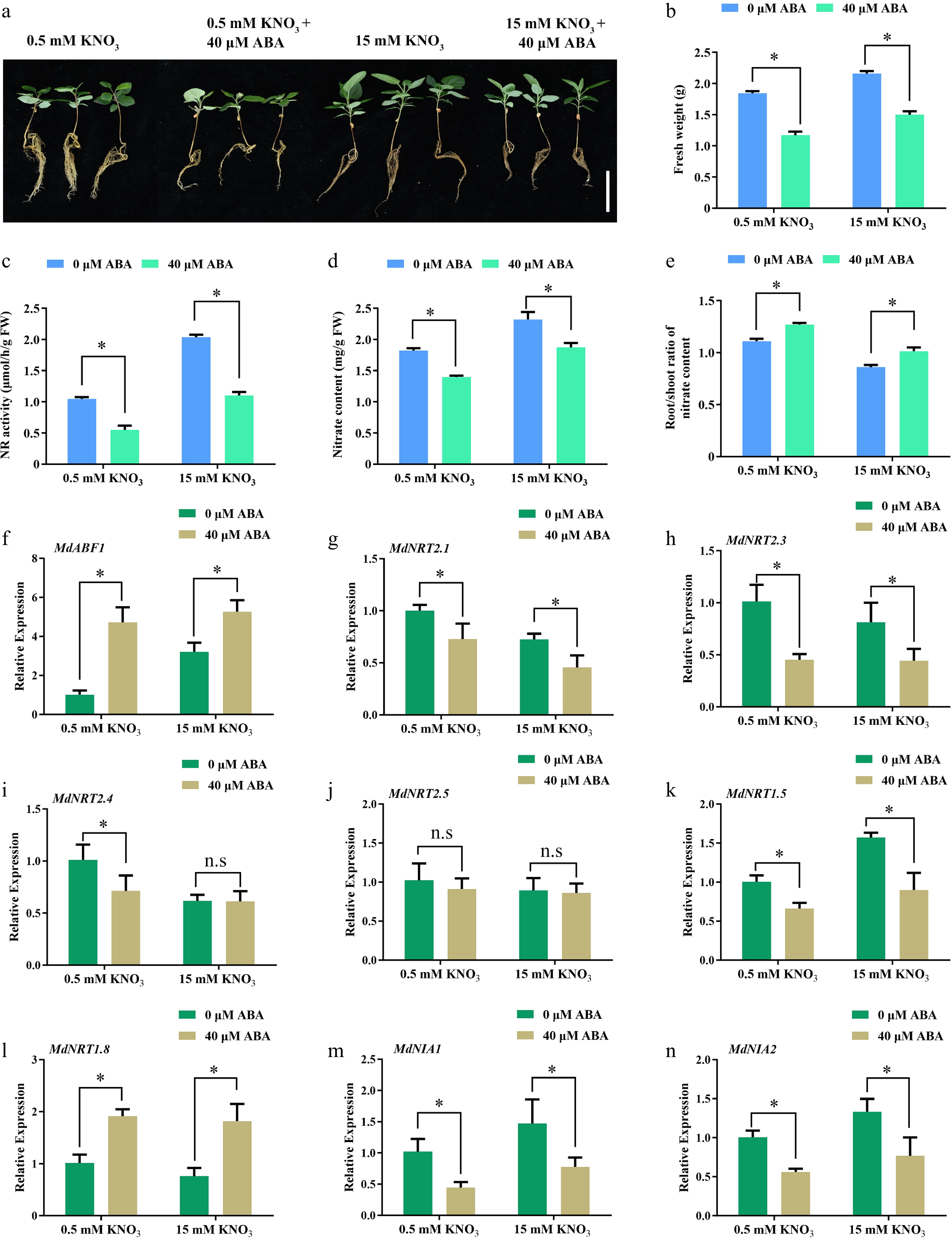 ABA regulates nitrate absorption and assimilation. (a) Phenotype of apple seedlings grown on low (0.5 mM KNO3), and high (15 mM KNO3) nitrate nutrient solutions containing different ABA concentrations (0 or 40 μM). (b) Fresh weight, (c) nitrate reductase activity, (d) nitrate content, (e) root/shoot ratio of nitrate content in (a). The relative expression of (f) MdABF1, and (g)−(n) nitrate absorbing, transporting, and assimilation genes. Plants were treated with high (15 mM) or low nitrate (0.5 mM) concentrations containing different ABA (0 or 40 μM) for 2 h, and RNA was extracted for gene expression analysis. Error bars exhibit the means ± SD of three independent replicates. Asterisks indicate significant differences (LSD test, *p < 0.05).
