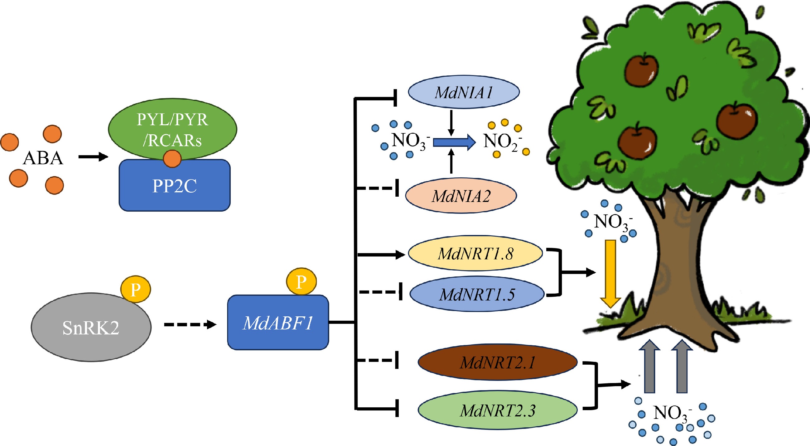 • Apples are one of the most popular and widely consumed fruits world wide. Belonging to the species Malus domestica in the rose family, they have been cultivated in Asia and Europe for thousands of years and were later brought to North America by European colonists. As an essential substance for plant growth and development, nitrate plays a crucial role throughout the entire lifecycle. However, research into the relationship between hormones and nitrogen is limited. This paper investigates the connection between ABA and nitrate. Our results demonstrated that ABA-regulated MdABF1 suppressed nitrate absorption and assimilation through directly downregulating MdNIA1 and MdNRT2.3 expression, but activated the expression of the MdNRT1.8 gene to promote nitrate retrieval. These results elucidate the molecular regulatory module of MdABF1-MdNRTs/NIAs and provide groundwork for understanding how ABA regulates nitrogen utilization.