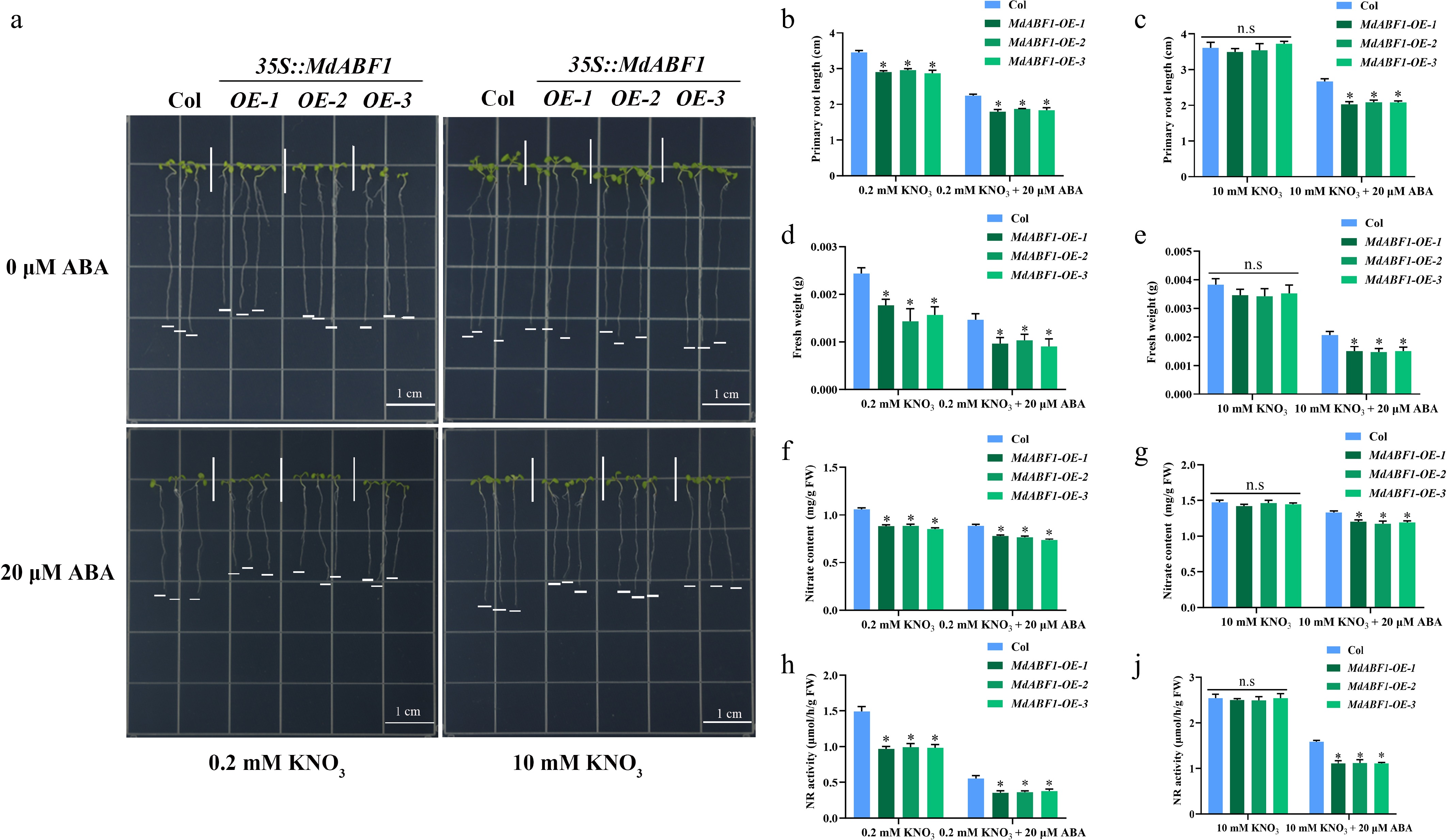 The Arabidopsis thaliana ecotype 'Columbia' (Col) was used for genetic transformation and functional identification. Arabidopsis seeds were grown on MS medium and vernalized at 4 °C for 3 d. The seeds were placed in an incubator for 1 week, and supplemented with 0.2 or 10 mM KNO3 and 0, 20, or 30 μM ABA under long-day conditions (16-h light/8-h dark) at 22 °C.