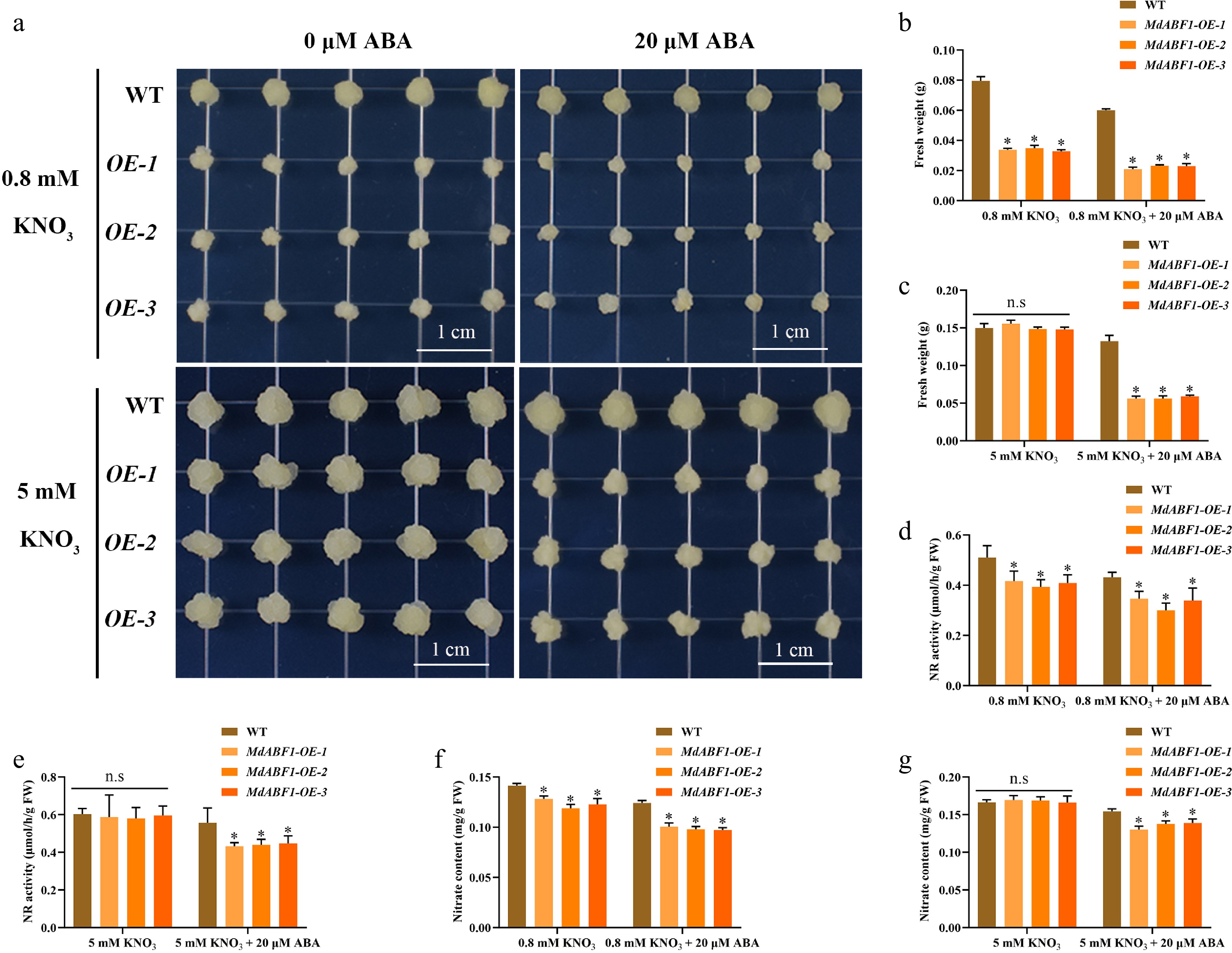 To elucidate the role of MdABF1 more comprehensively, we obtained MdABF1 overexpressing Arabidopsis and apple calli by the Agrobacterium-mediated method (Supplementary Fig. S1eh). The overexpressed materials were treated with or without ABA under high and low nitrogen conditions. The results indicated that lines overexpressing MdABF1 in Arabidopsis and apple calli displayed significantly shorter primary roots (Fig. 2ac, Supplementary Fig. S2a, b) and reduced biomass when subjected to low nitrate and ABA treatment compared to the wild-type, as evidenced by significantly lower fresh weights (Fig. 2d, e, Supplementary Fig. S2c, d, Fig. 3ac, Supplementary Fig. S2i, j). Nitrate content and NR activity were decreased in overexpressed Arabidopsis and apple calli (Figs 2fi and 3dg, Supplementary Fig. S2eh, S2kn). The findings suggest that the overexpression of MdABF1 results in decreased nitrate content and NR activity, thereby impeding growth under conditions of low nitrate and ABA exposure, in both low and high nitrate environments.