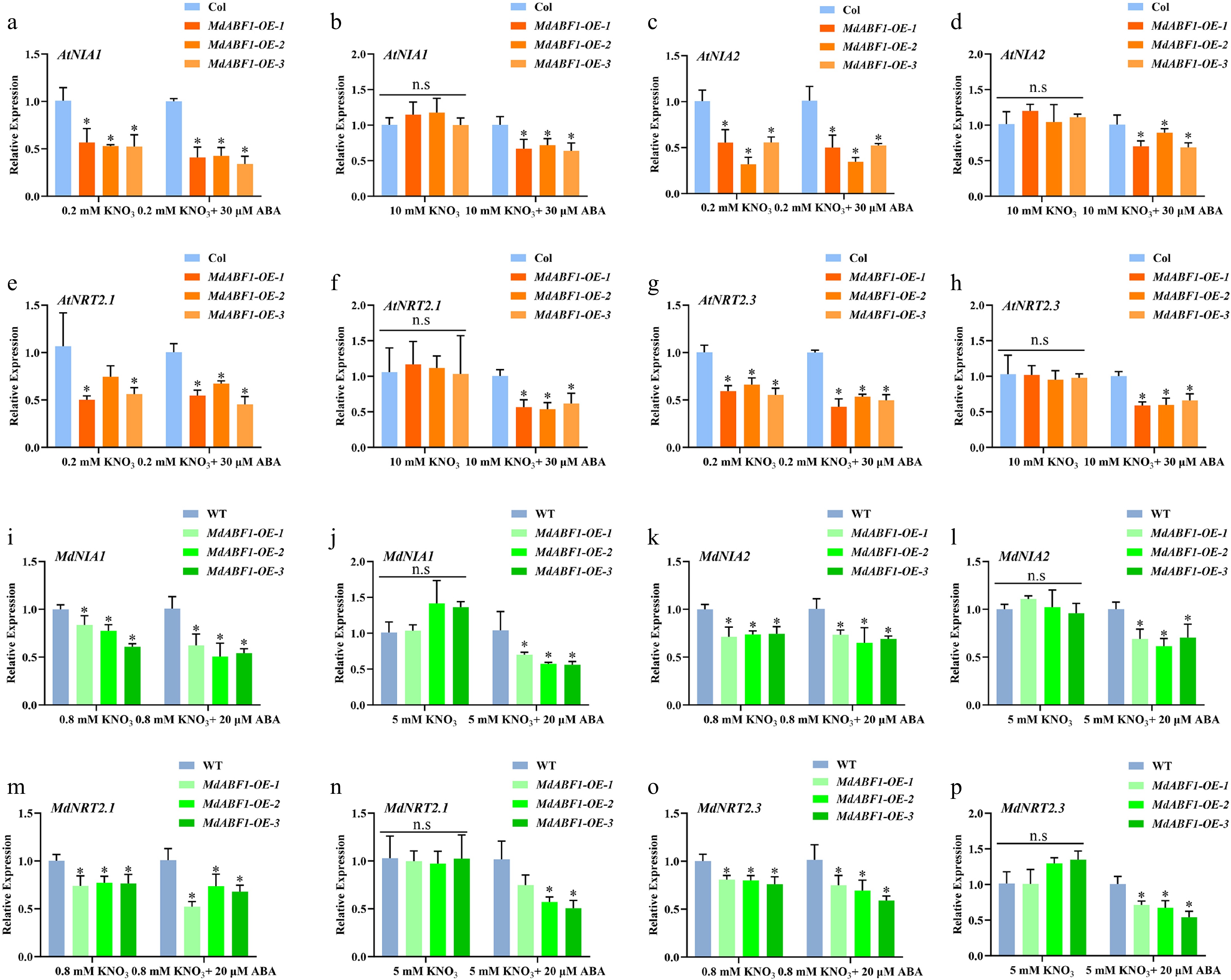 • To further unravel the molecular mechanisms underlying MdABF1-mediated nitrate utilization, we analyzed data from previous research studies[45]. Chromatin immunoprecipitation (ChIP) and Transient Assay Reporting Genome-wide Effects of Transcription factors (TARGET) analyses identified NRT2.1, NIA1, and NIA2 as downstream targets of ABF involved in nitrate utilization. However, NIA1, NIA2, NRT2.1, and NRT2.3 were all involved in the nitrate utilization under the low nitrate and ABA treatment (Fig. 1fn), and these genes were downregulated in the MdABF1 overexpressed materials (Fig. 4ap, Supplementary Fig. S3ap). MdABF1 was found to inhibit the expression of the NIA1, NIA2, NRT2.1, and NRT2.3 genes to a greater extent following exogenous ABA treatment in Arabidopsis and apple calli (Fig. 4ap, Supplementary Fig. S3ap). The data demonstrate that the MdABF1 gene suppresses the expression of NIA1, NIA2, NRT2.1, and NRT2.3 under low nitrate conditions, with the inhibitory effect being more pronounced in the presence of ABA.