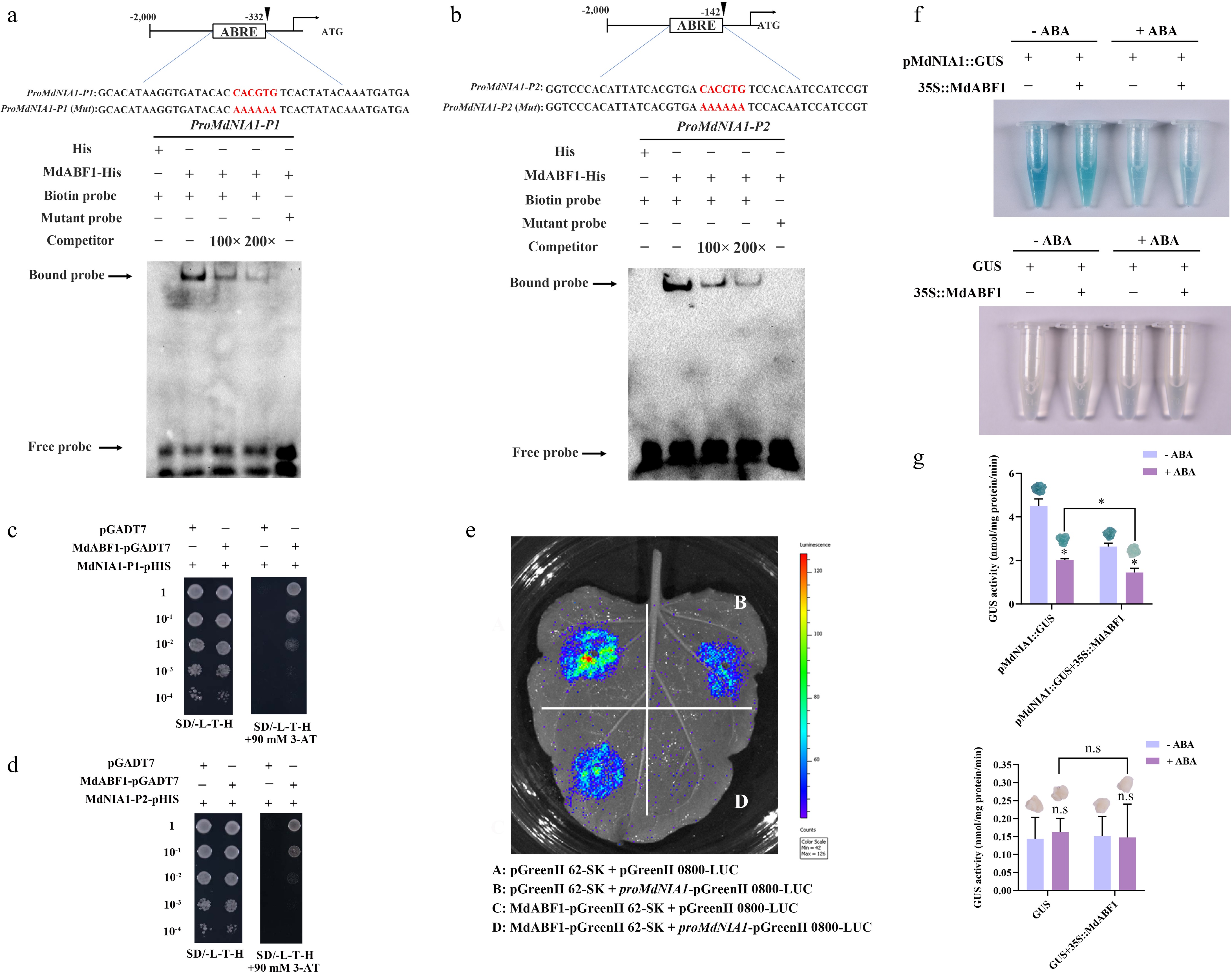 MdABF1 binds to the promoter of MdNIA1. EMSA analysis showing the binding of MdABF1 to the (a) P1, and (b) P1 fragments of MdNIA1 promoter. Diagrams of the promoter of MdNIA1 are shown above. (c), (d) Y1H assay of the binding of MdABF1 to the MdNIA1 promoter in vitro. (e) Dual luciferase assays in tobacco leaves showing that MdABF1 transcriptionally repressed the expression of MdNIA1. (f) GUS staining experiment of apple calli showing that the repression of MdABF1 to the MdNIA1 promoter dependent on ABA. (g) GUS activity in (f). Error bars exhibit the means ± SD of three independent replicates. Asterisks indicate significant differences (LSD test, *p < 0.05).