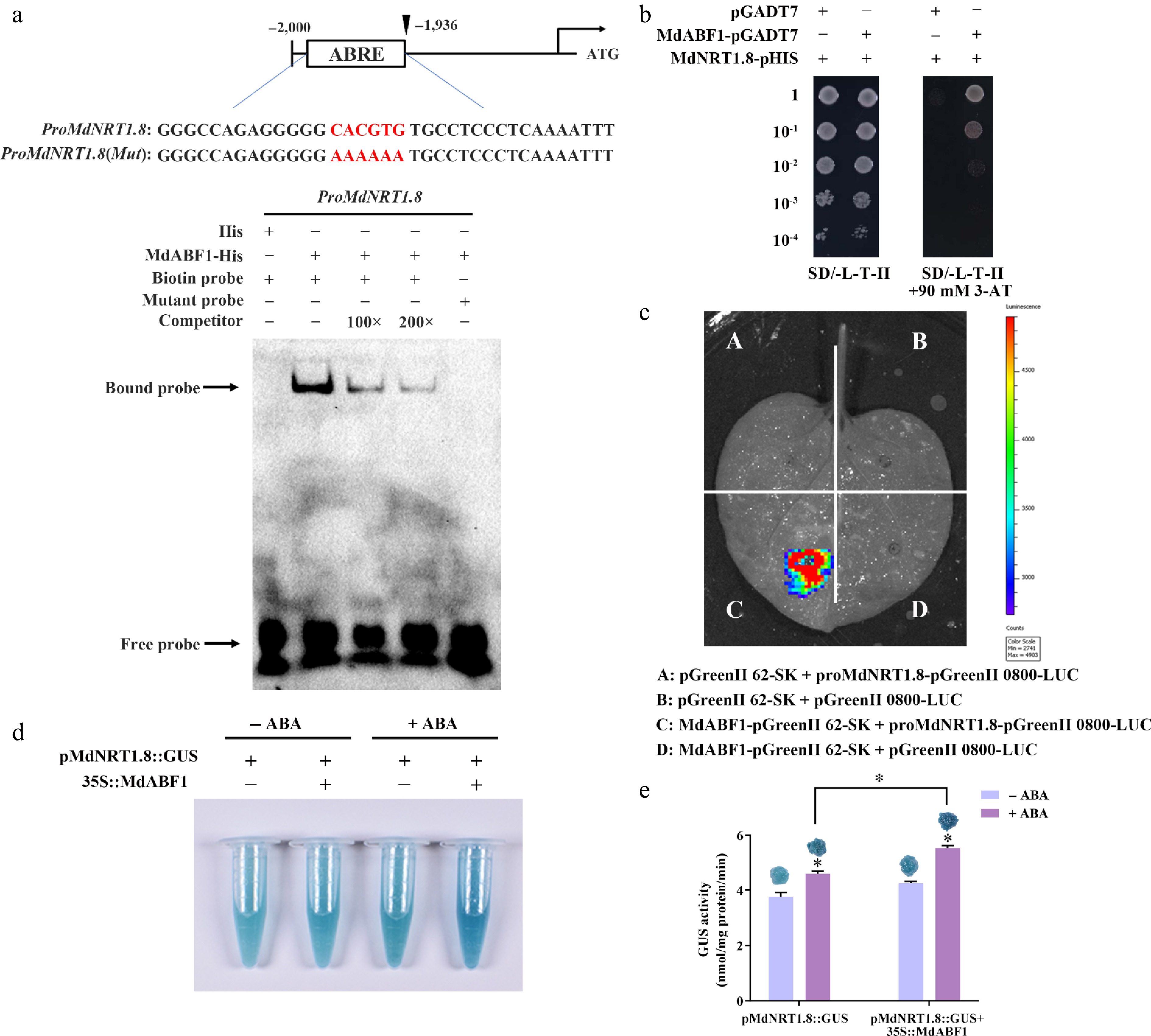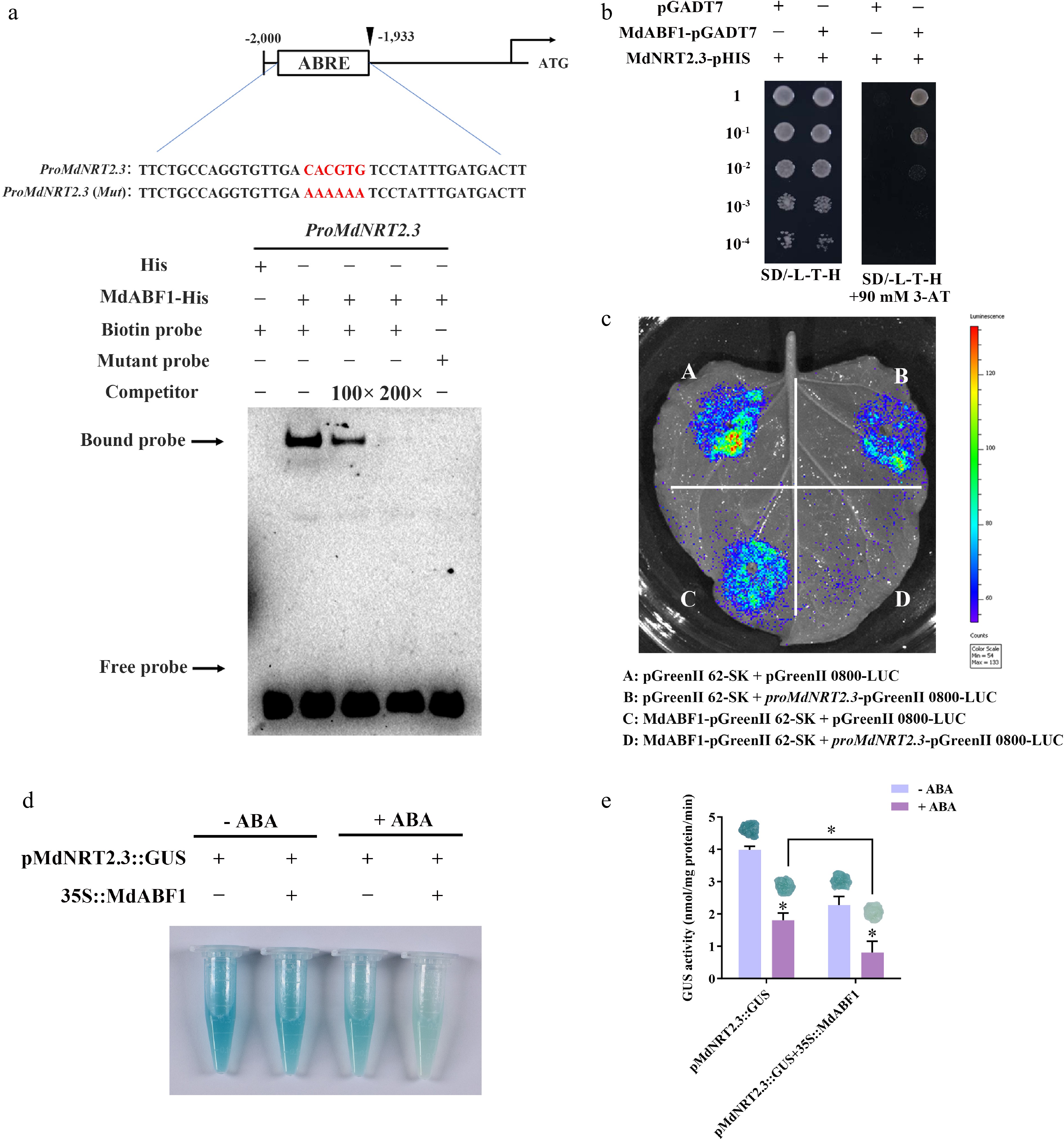 MdABF1 binds to the promoter of MdNRT2.3. (a) EMSA analysis showing the binding of MdABF1 to the MdNRT2.3 promoter. Diagram of the promoter of MdNRT2.3 is shown above. (b) Y1H assay of the binding of MdABF1 to the MdNRT2.3 promoter in vitro. (c) Dual luciferase assays in tobacco leaves showing that MdABF1 transcriptionally repressed the expression of MdNRT2.3. (d) GUS staining experiment of apple calli showing the repression of MdABF1 to the MdNRT2.3 promoter. (e) GUS activity in (d). Error bars exhibit the means ± SD of three independent replicates. Asterisks indicate significant differences (LSD test, *p < 0.05).