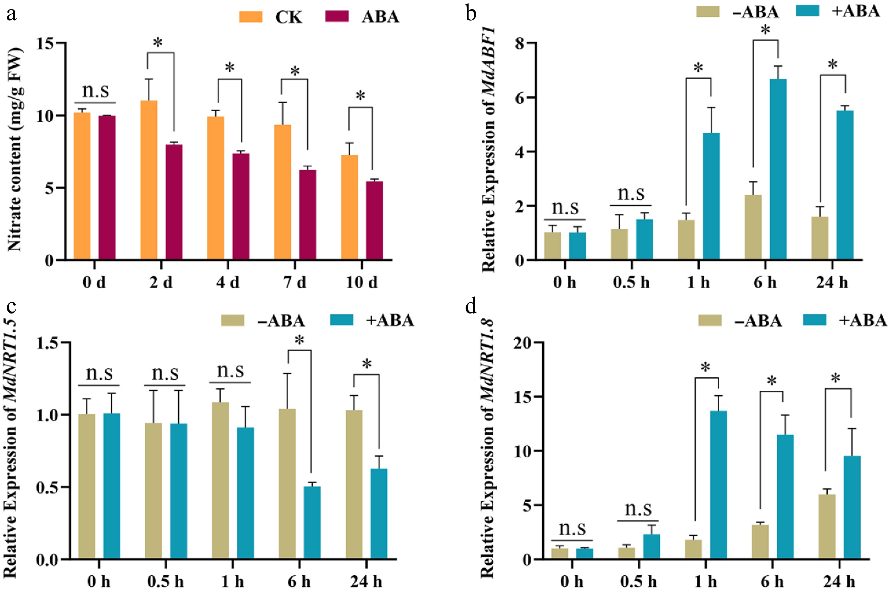 The branches of Red 'Fuji' apple trees were taken from the Experimental Station of Shandong Agricultural University (Shandong, China). The branches were sprayed three times with 0 or 50 μM ABA. Subsequently, the two groups of branches were incubated at 25 °C for 16-h light/8-h dark and sampled at 0, 1, 3, 6, and 12 h for gene expression, and at 0, 2, 4, 7, and 10 d for nitrate content and NR activity analyses.
