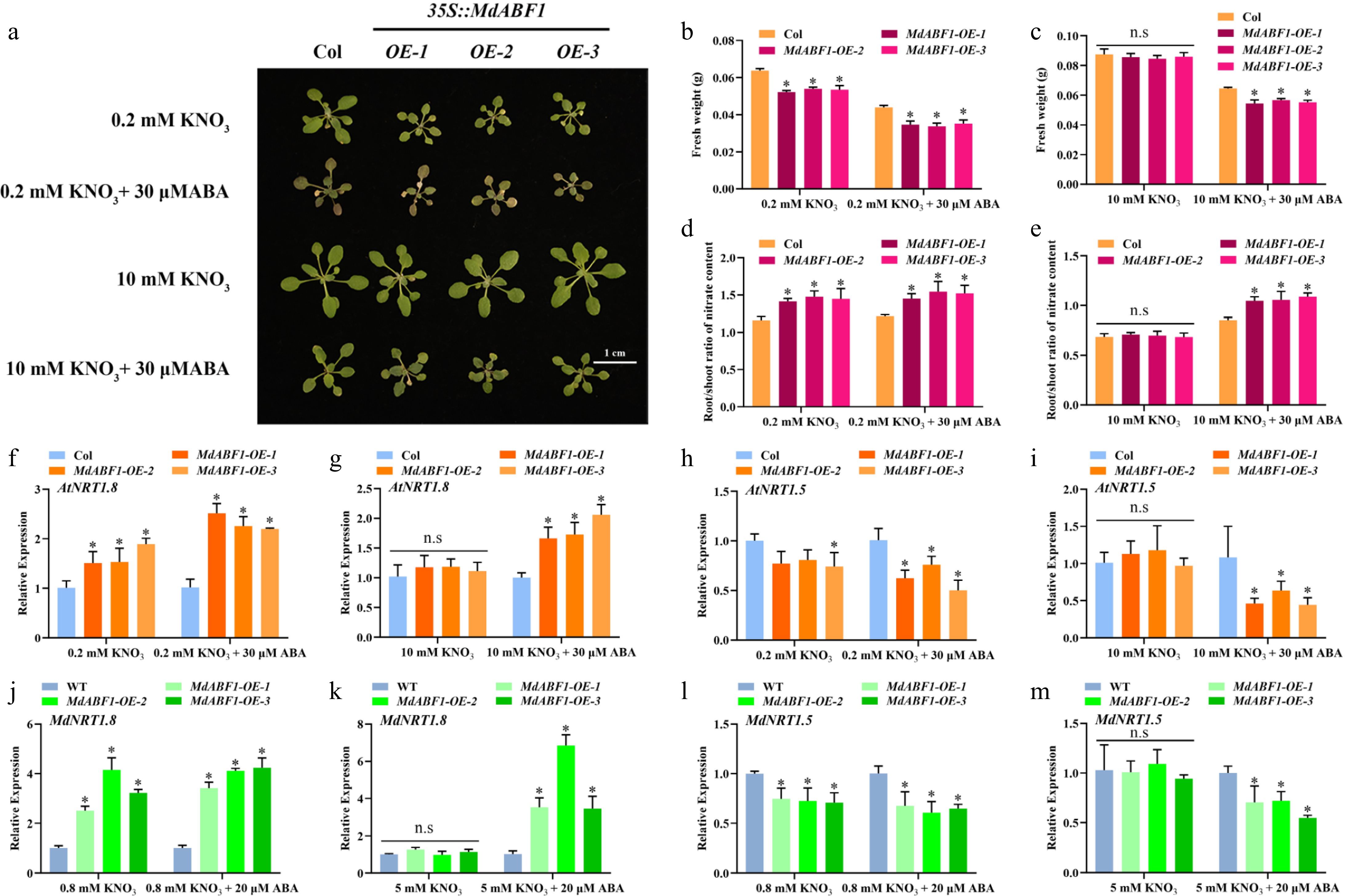 MdABF1 plays a positive role in nitrate transport. (a) Phenotype of MdABF1 overexpression Arabidopsis treated with different concentrations of nitrate (0.2 or 10 mM KNO3), and ABA (0 or 30 μM). (b), (c) Fresh weight and (d), (e) root/shoot ratio of nitrate content in (a). Expression of (f), (g) AtNRT1.8 and (h), (i) AtNRT1.5 genes in Arabidopsis. Expression of (j), (k) AtNRT1.8 and (l), (m) AtNRT1.5 genes in apple calli. Error bars exhibit the means ± SD of three independent replicates. Asterisks indicate significant differences (LSD test, *p < 0.05).